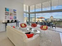 Opening up to a modern, spacious open plan design, a wall of floor to ceiling glass encapsulates the views on show. Over 10 acres of parkland with a lake, front the apartment while to the left, panoramic ocean views will take your breath away. Filling up the apartment with natural light, extra high ceilings elevate an already overwhelmingly spacious feeling which is further enhanced by a loft over the lounge area. Effortlessly flowing onto a huge covered balcony, it stretches the width of the apartment enabling more than enough room to position the barbecue, lounge chairs and alfresco dining table.