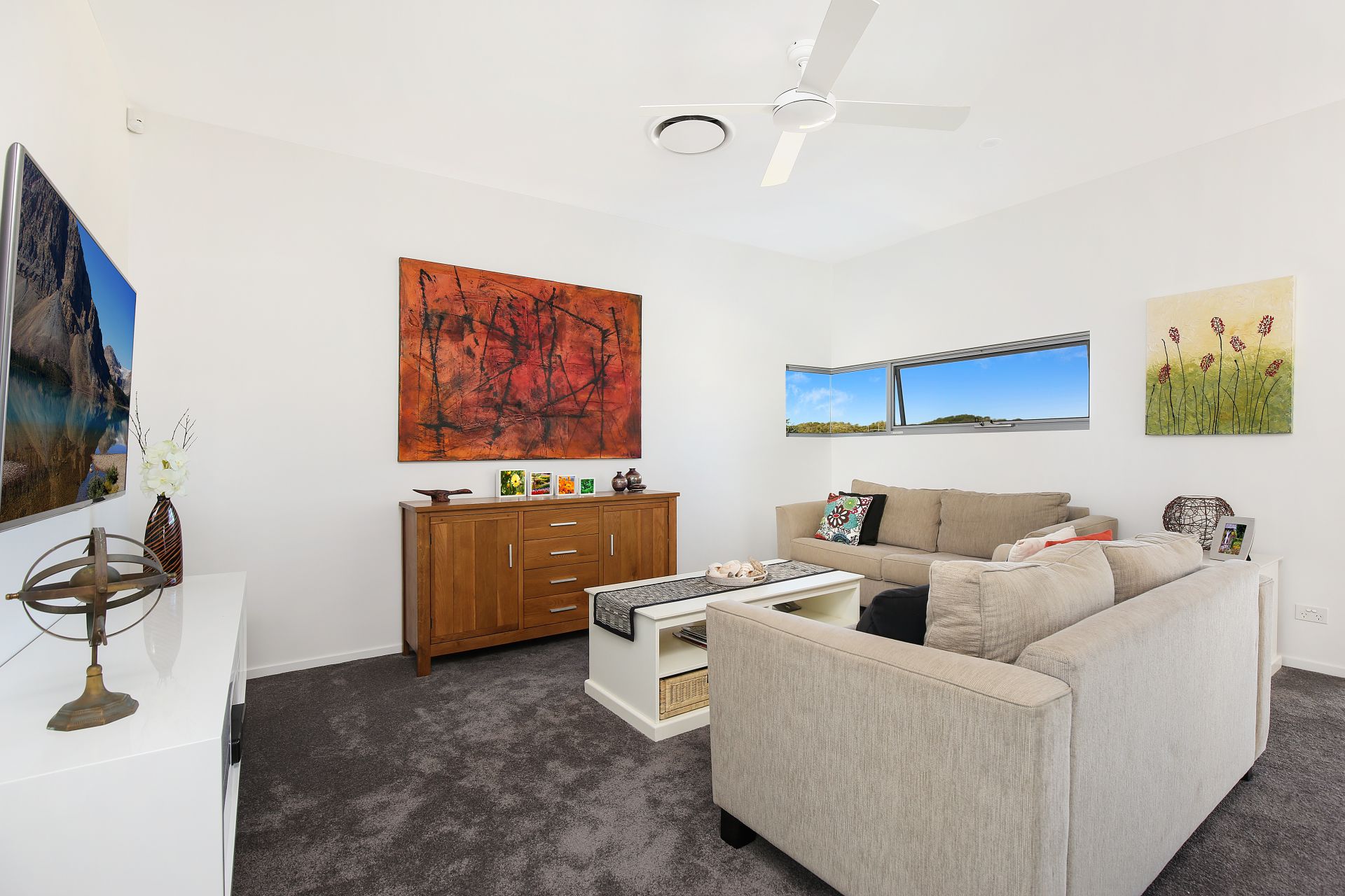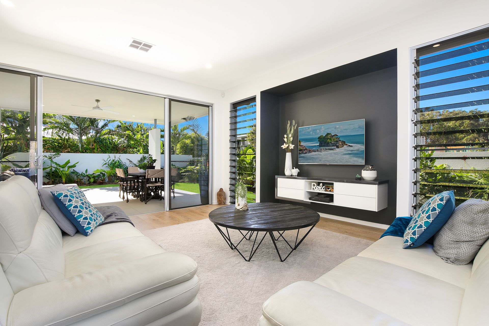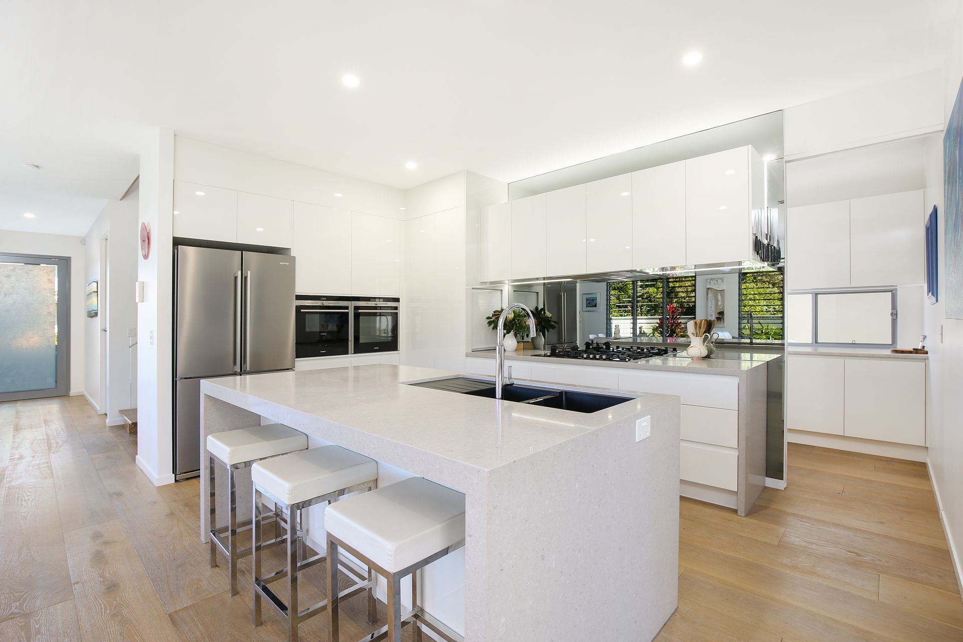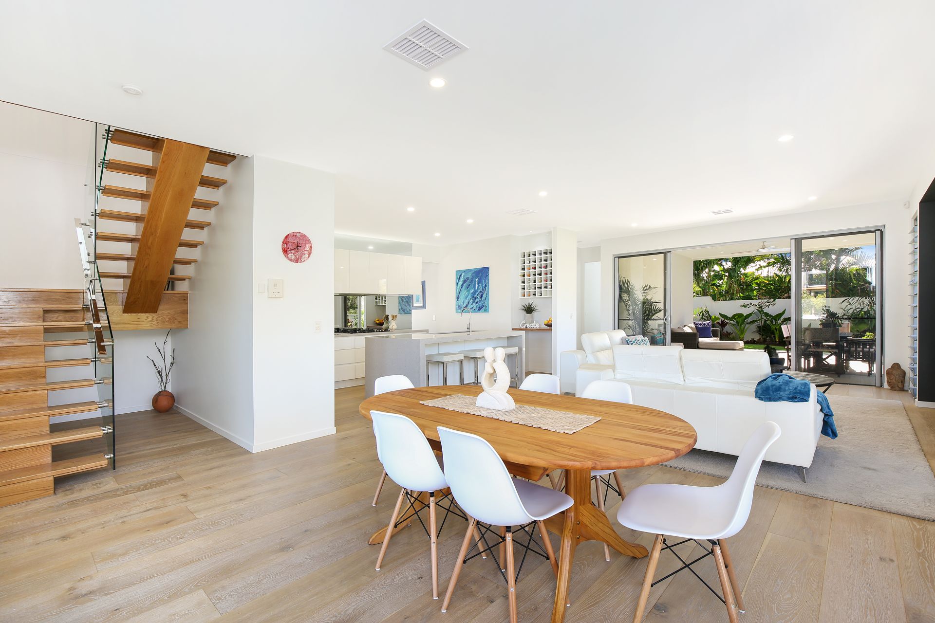 An understated ambience of casual luxury pervades throughout, and premium fixtures and fittings include: solid aluminium and glass front door, zoned air-conditioning, waterfall edge stone benches, NBN network, gas cook top, stainless steel appliances, timber floors on ground level, internal timber staircase, ceiling fans, 3.5kW solar power, alarm system, direct external access from guest bedroom on ground floor, plus generous storage.
