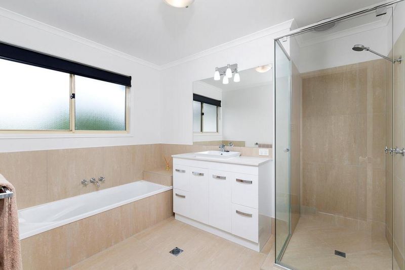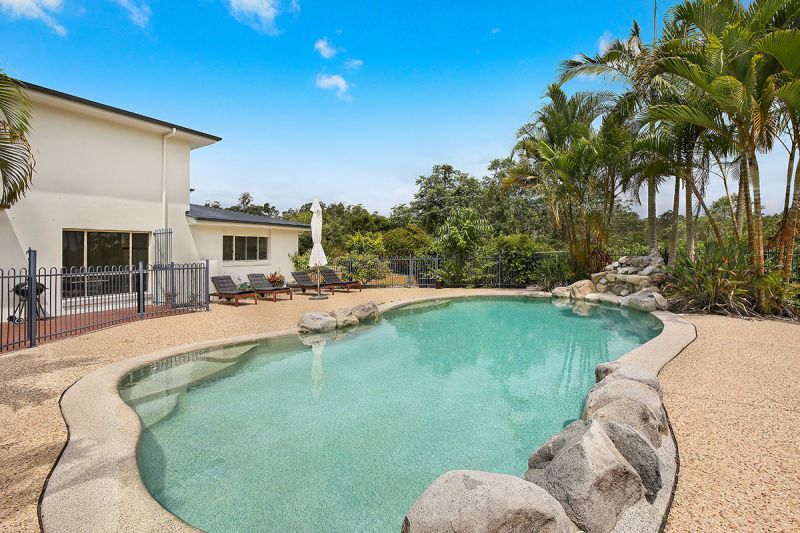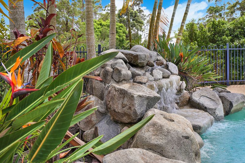 Features include: ducted air-conditioning, north facing upper balcony, stone benches in kitchen, stainless steel appliances, gas cook top, ceiling fans, spa bath in ensuite, waterfall feature by pool, expansive sunbathing terrace, masses of storage, garden shed, and there is a large grassed area for children and pets to play.