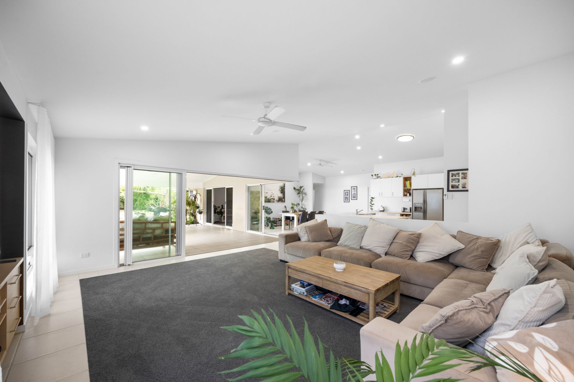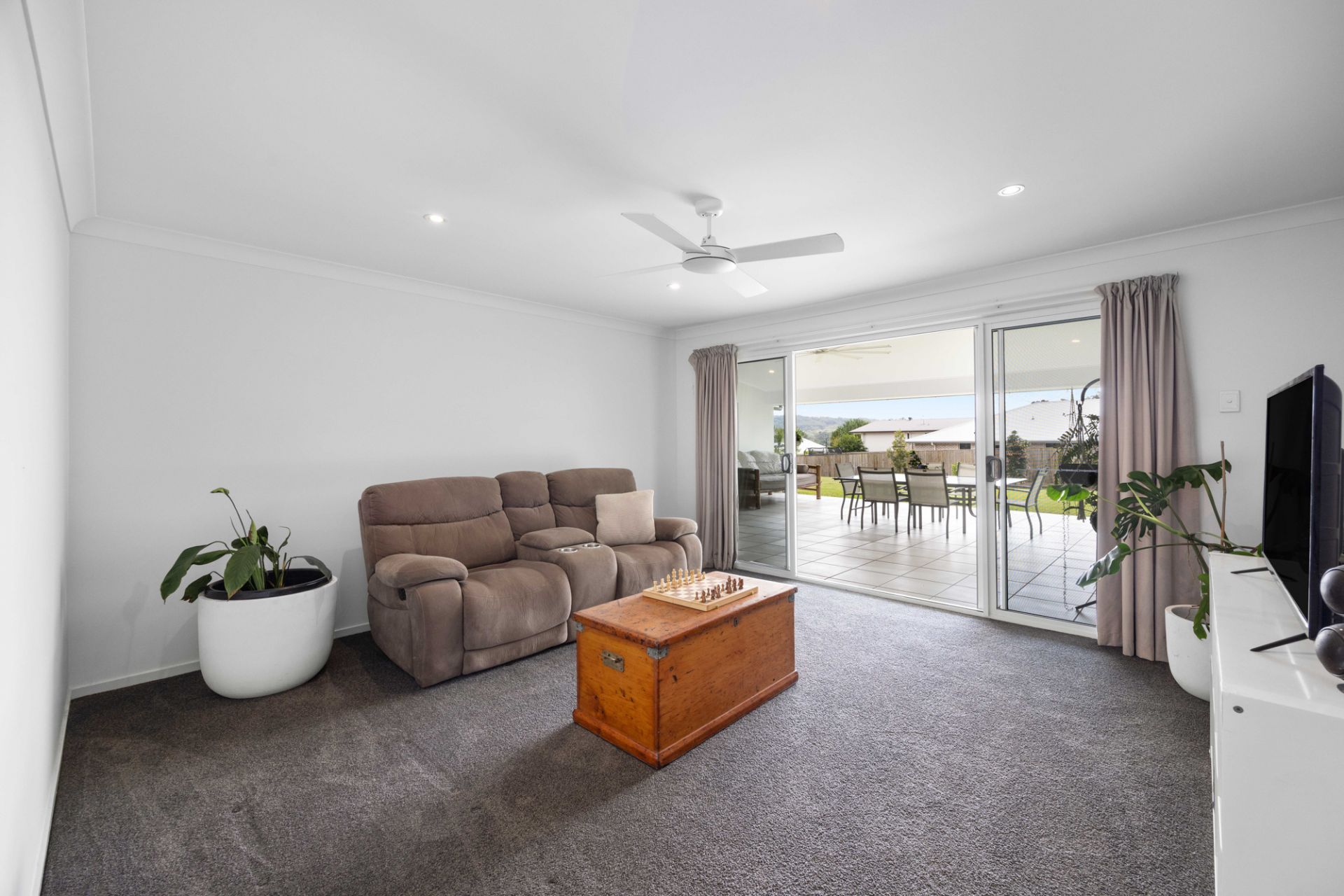 Raked ceilings in living/dining/kitchen, ceiling fans throughout, floaty sheer full length curtains, plush carpets in family room and bedrooms, easy-care tiling in living/dining, hardwood timber flooring at entry, double shower in ensuite, dual vanities and separate shower and bath in family bathroom, stacker doors from all living areas to patio, external access from master, security screens, solar hot water, and solar power – are among the home's notable features.