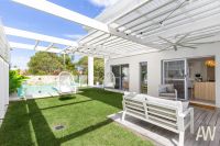 The home comprises three well-appointed bedrooms. The main bedroom includes a large ensuite and air conditioning, while the two additional bedrooms are separated by a two-way bathroom, providing a convenient layout for families. Guests can utilise the separate powder room, ensuring a level of privacy is maintained.