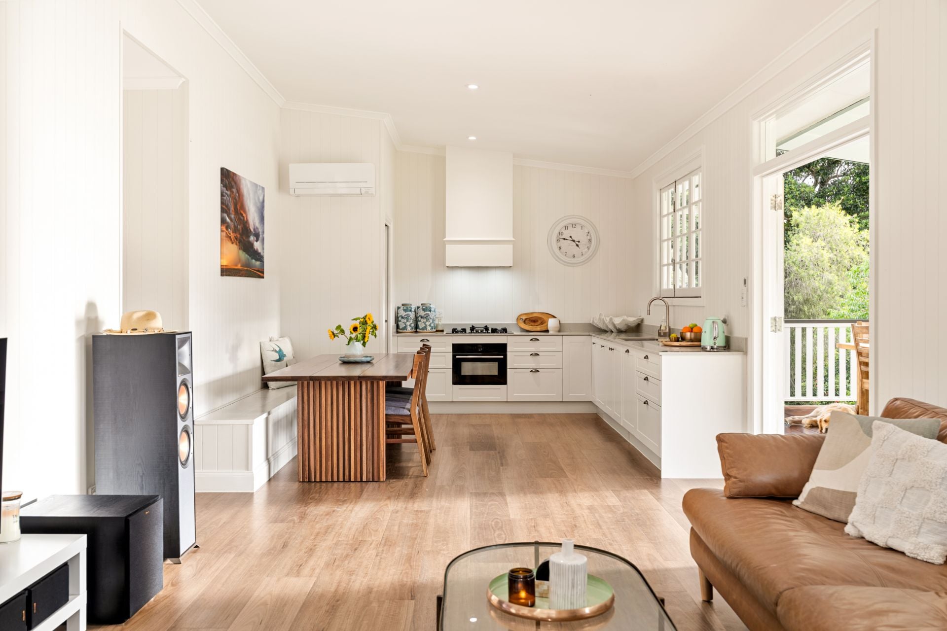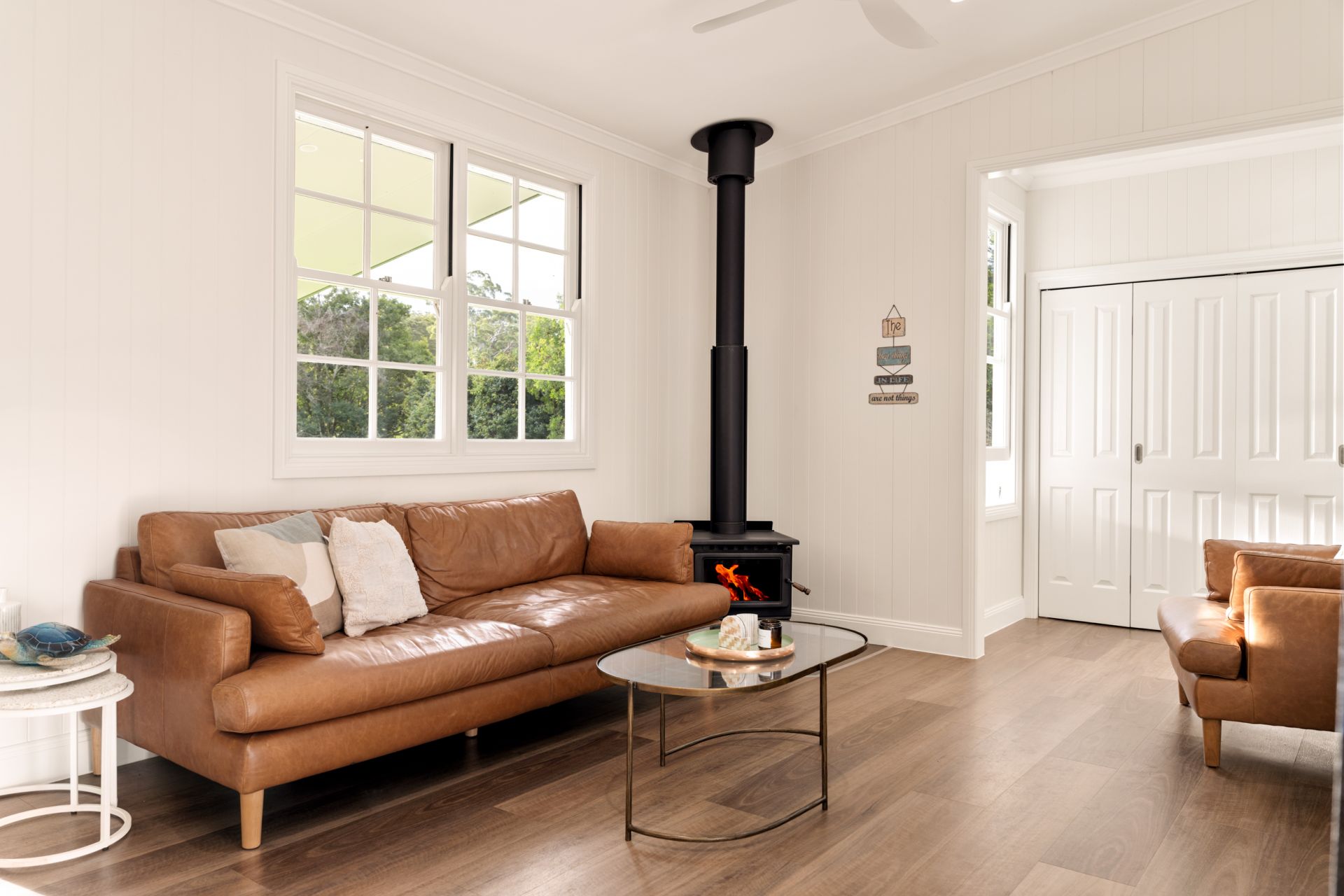 Inside, soaring 2.7m ceilings and a striking raked ceiling in the main living area enhance the sense of space, complemented by expansive timber windows and doors that invite natural light throughout. VJ walls add warmth and character, while the home is exceptionally well insulated to ensure year-round comfort. Air conditioning in the main living zone, along with a fireplace, provides both cooling and warmth as needed.