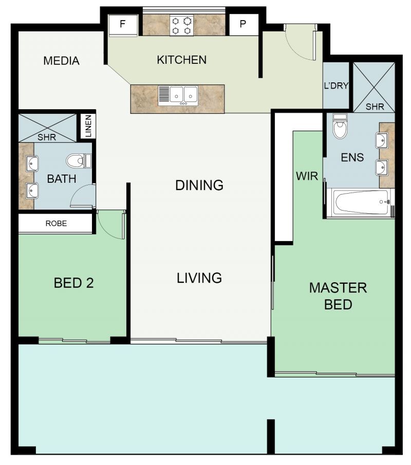 Complete with two bedrooms, two luxury bathrooms, well equipped central kitchen, open plan living flowing out to balcony which showcases glorious views of the 10 acre park and lagoon opposite, separate laundry, secure parking for two vehicles plus a lock-up storage area.