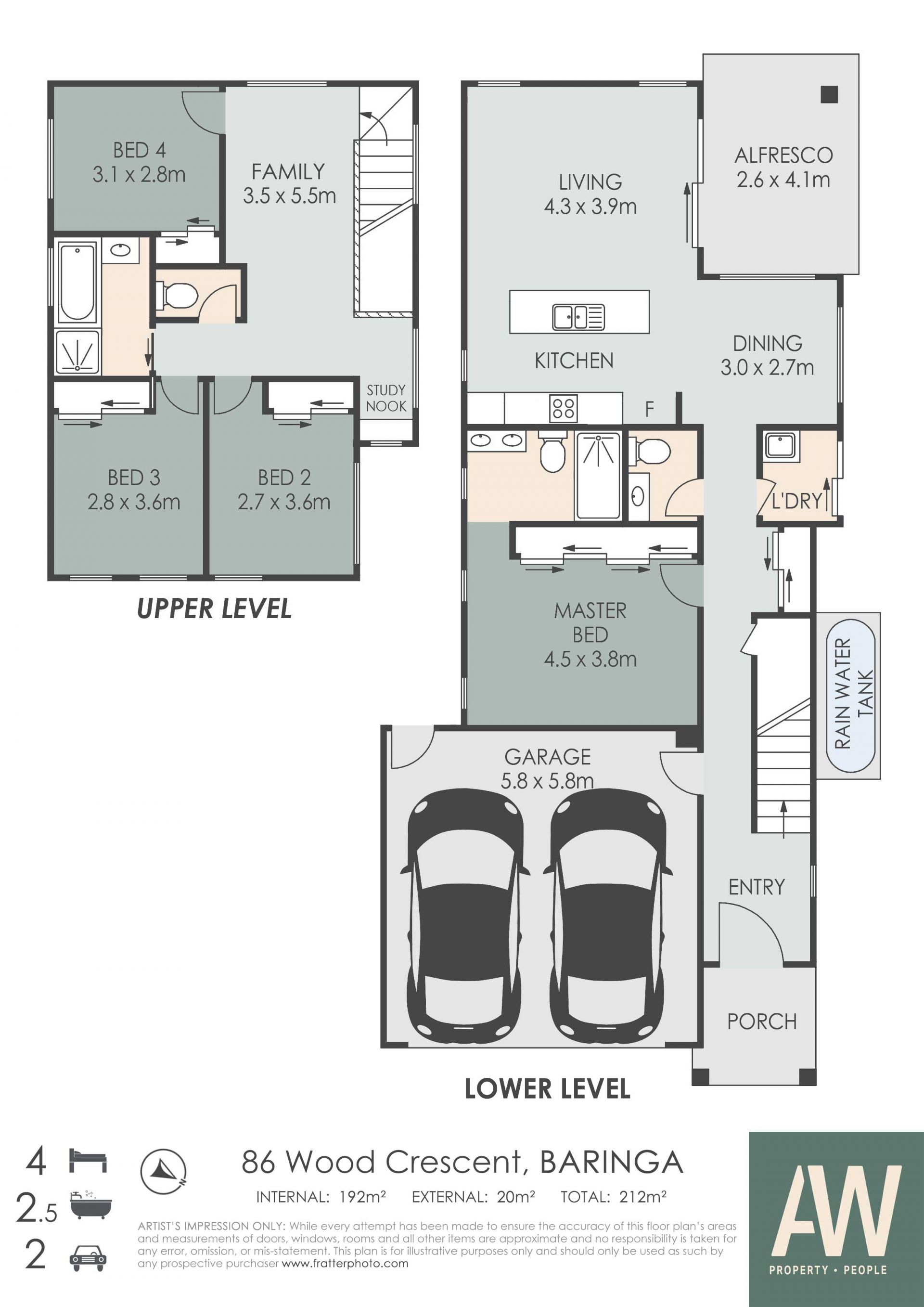 Situated on the lower level, you will find the spacious master bedroom with built-in robe, ceiling fan, air conditioning, and ensuite featuring oversized shower. At the rear of the property is the open plan kitchen, dining and living areas as well as the outdoor covered entertaining space, allowing you to enjoy family and friend get togethers or simply watch the kids play in the grass area. The modern kitchen featuring quality appliances, gas-cooking, 900mm standalone oven, dishwasher, stone benches, plenty of storage. The lower level is also serviced with a separate powder room, double garage with internal entry, and laundry to add to the convenience.