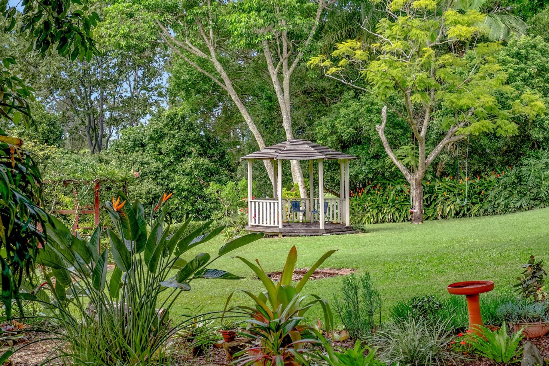 Infrastructure on the property includes bitumen driveway with circular turning area alongside house, full fencing, solar-powered gate at entry, garden structures such as gazebo and arbor with leafy canopy, and 3-phase powered 5-bay shed with 3 x roller doors and 2 x open bays. All power and telecommunications services to home are underground.