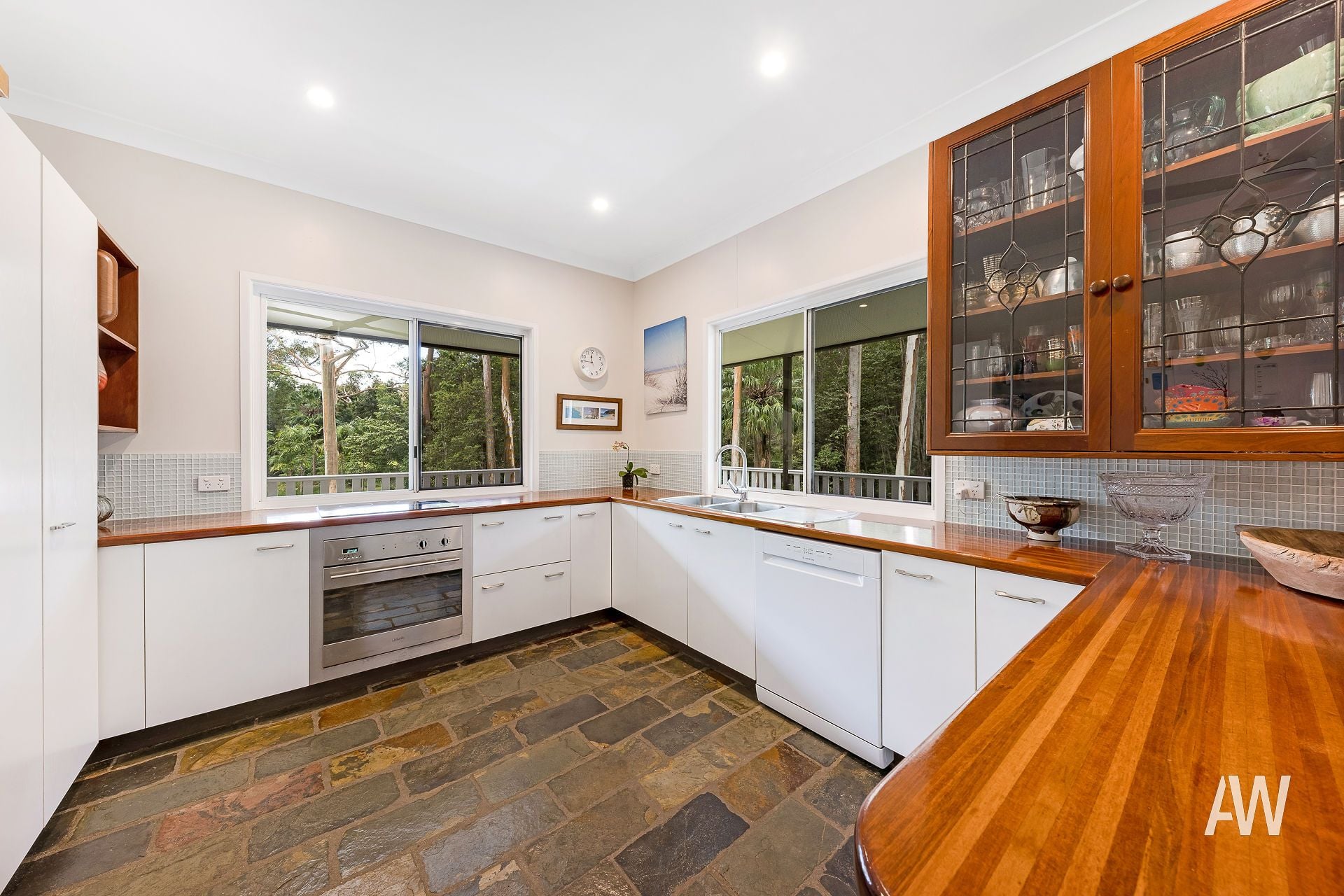 High 2700 ceilings, timber and slate flooring, split system air-conditioning, ceiling fans, fireplace, Jarrah benchtops in kitchen, crimsafe doors and windows, verandah access from three of the bedrooms, and oversized windows to invite in light and showcase leafy outlook – are features of the home, and presentation is pristine.