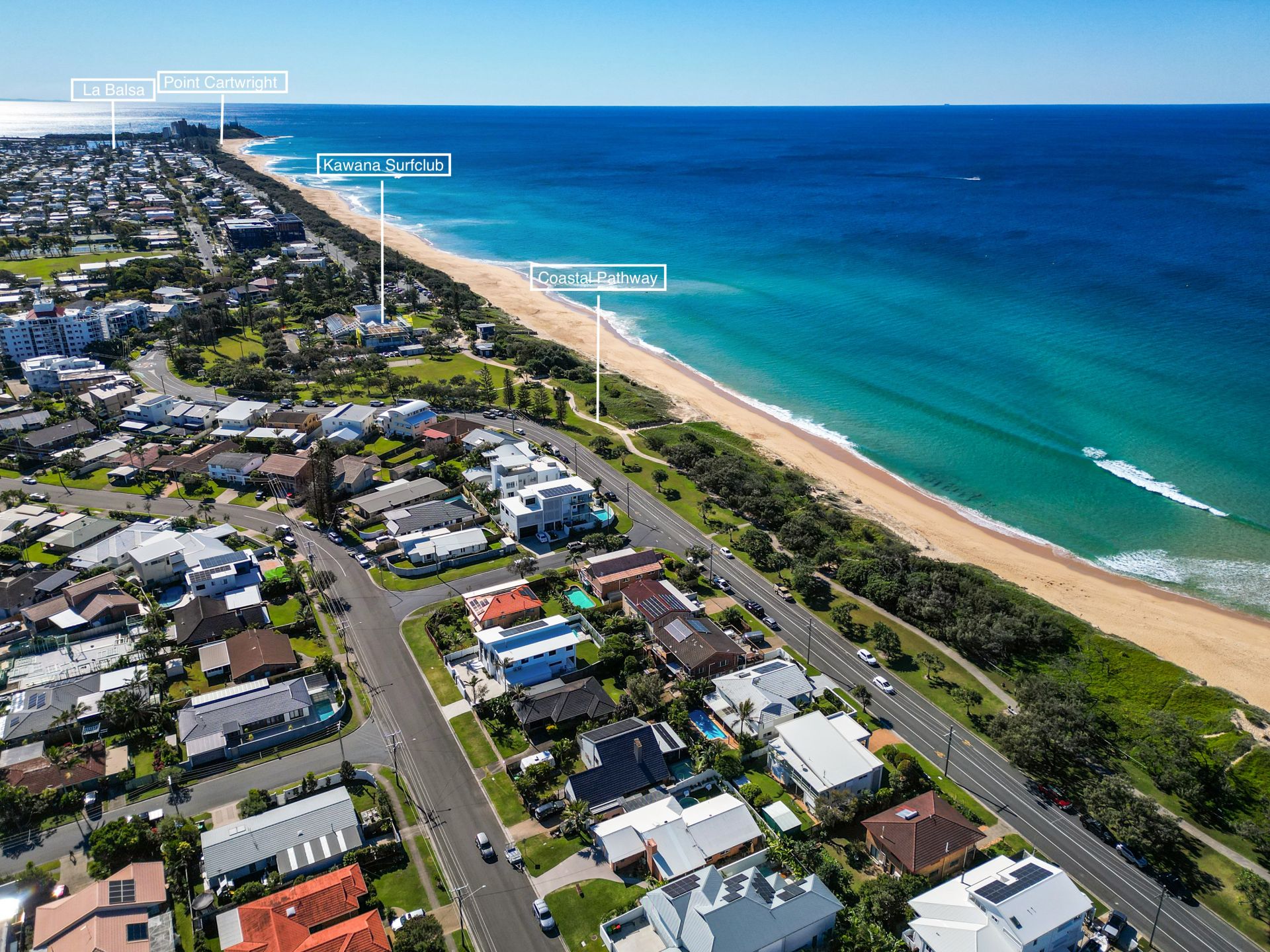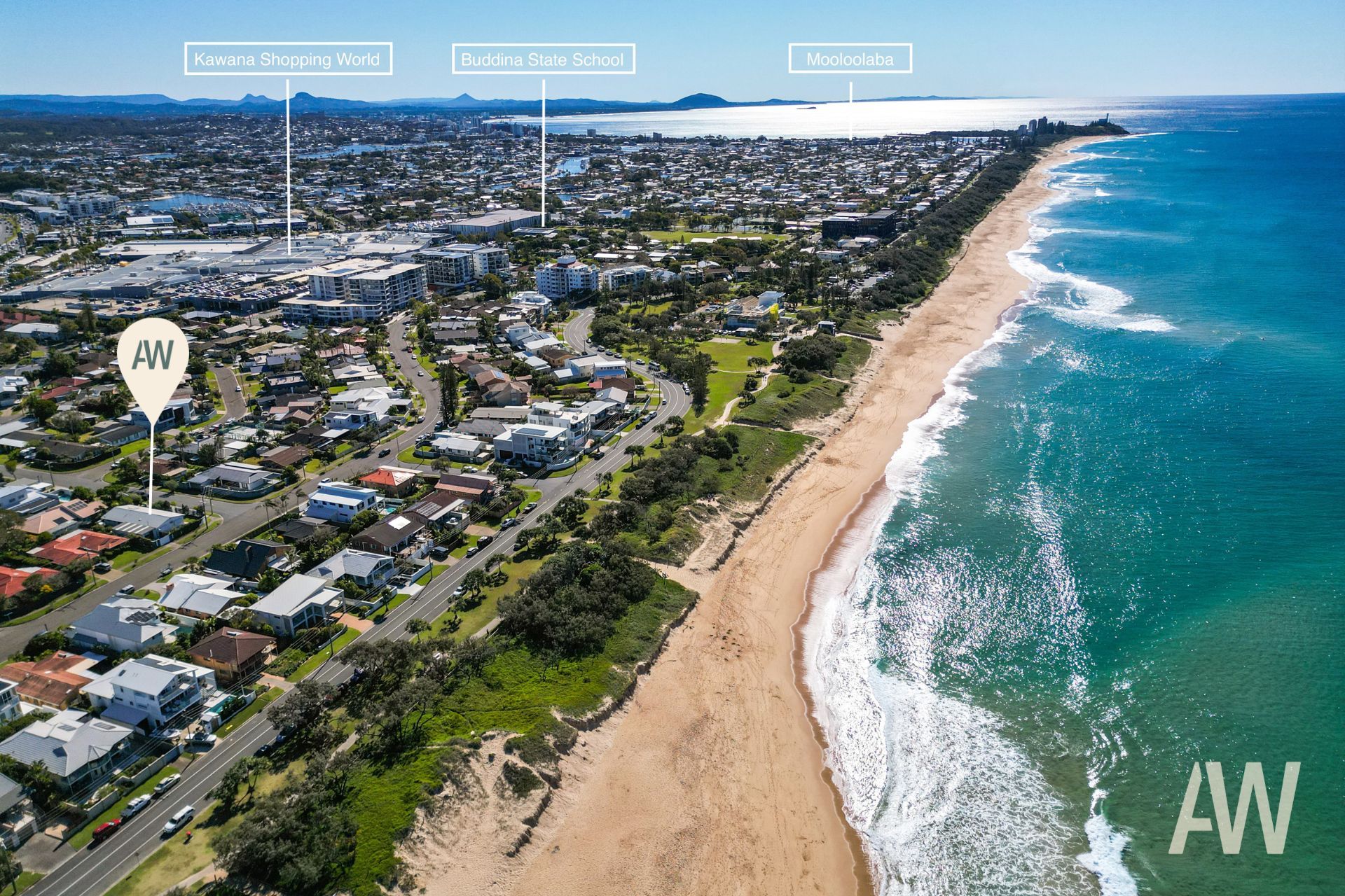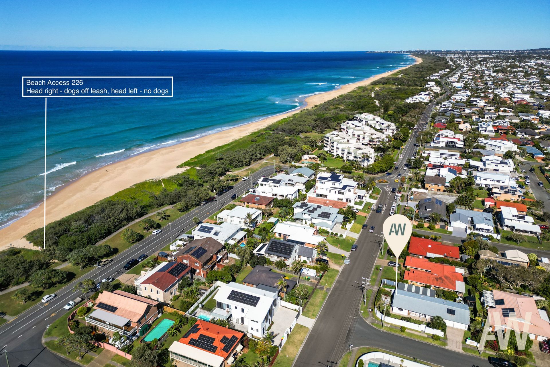 Located just 180 metres to beach access 226, head left for a peaceful, dog-free stretch of sand, or turn right to enjoy the off-leash dog beach. Kawana Surf Club and patrolled swimming is a five minute walk, as is Kawana Shoppingworld and cinemas; it's seven minutes' walk to Buddina State School, one-kilometre to Kawana Tennis Club, and 15 minutes' walk to the waterfront hotel and marina.