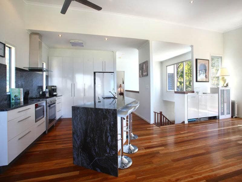 Clean white lines against warm timber floors provide the perfect backdrop for statement finishes such as granite bench tops to really take centre stage.