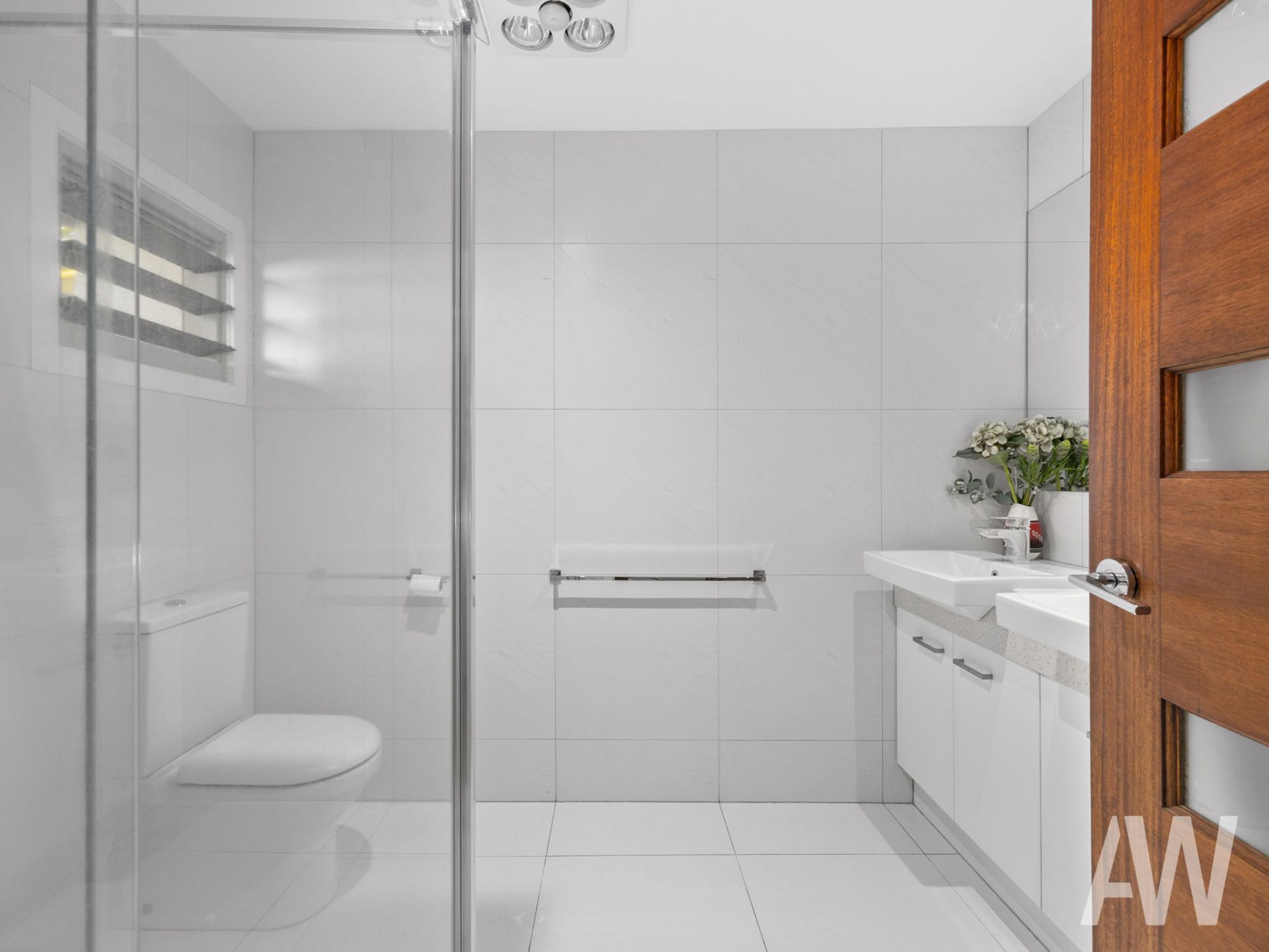 The home's grand facade leads to a spacious and welcoming entrance, hinting at the elegance within. A sanctuary of style and comfort unfolds across a single level, featuring four generously sized carpet bedrooms, including a master suite with a walk-in wardrobe, desk space, and a deluxe ensuite. Another bedroom enjoys the privacy of its own ensuite, while the large main bathroom caters to the rest of the household with double sinks, a substantial shower and bath opening onto a private courtyard with double solid timber doors.