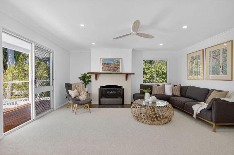 Upstairs is the main hub of the home, featuring an inviting kitchen, dining and two separate living zones centred around a cosy open fireplace. A skylit luxury bathroom and three spacious bedrooms – all with elevated views stretching out to the Glasshouse Mountains – complete this level.