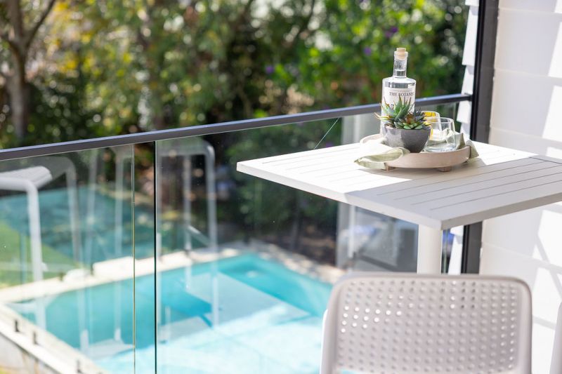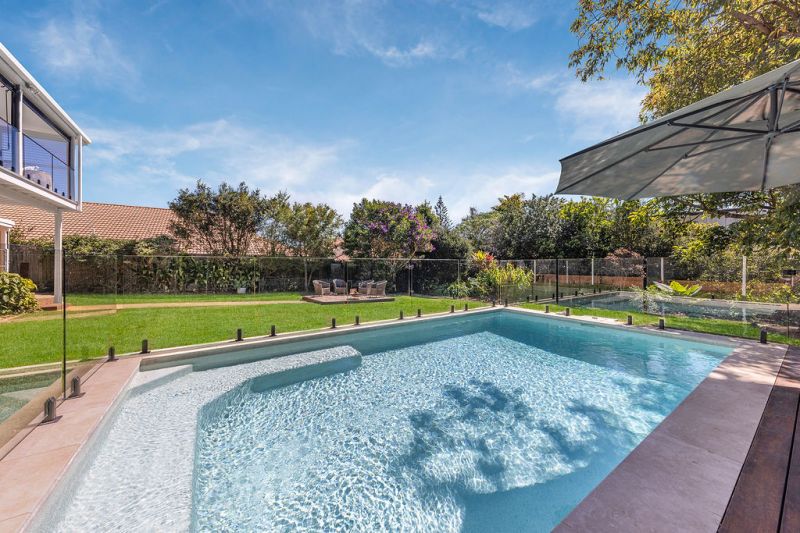 • A sparkling salt-cell swimming pool with frameless glass fencing and sunbathing deck