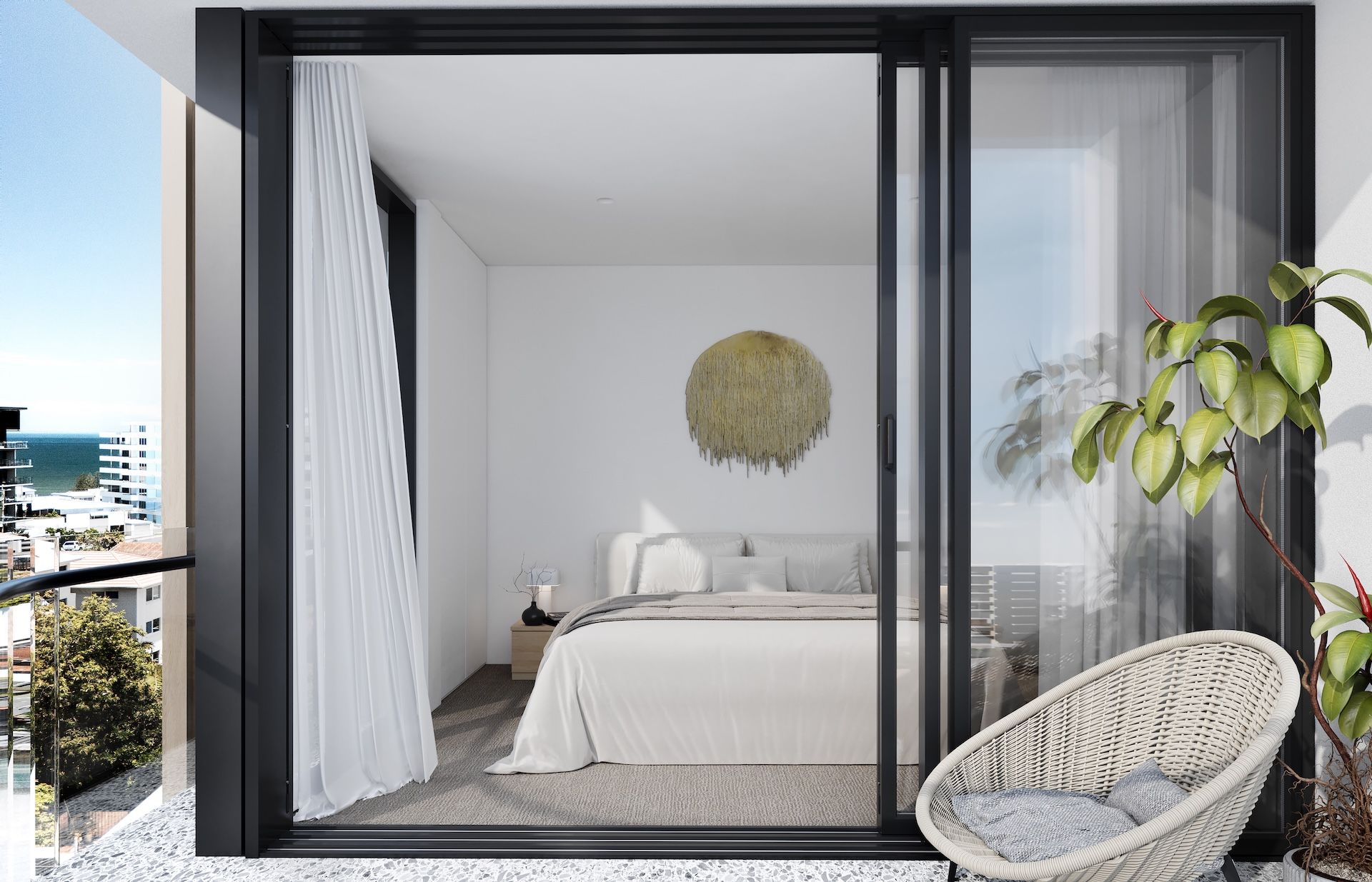 Expansive curved balconies and floor-to-ceiling glazing seamlessly connect interiors with the surrounding coastal landscape, creating homes that feel both refined and relaxed.