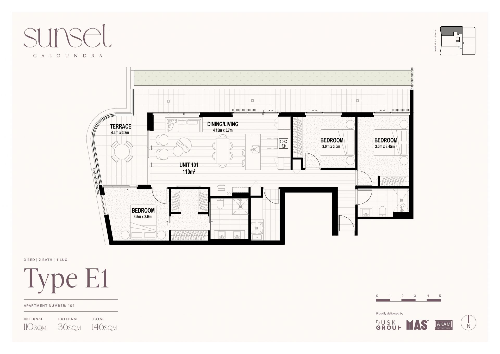 110sqm internal + 36sqm terrace (146sqm total)