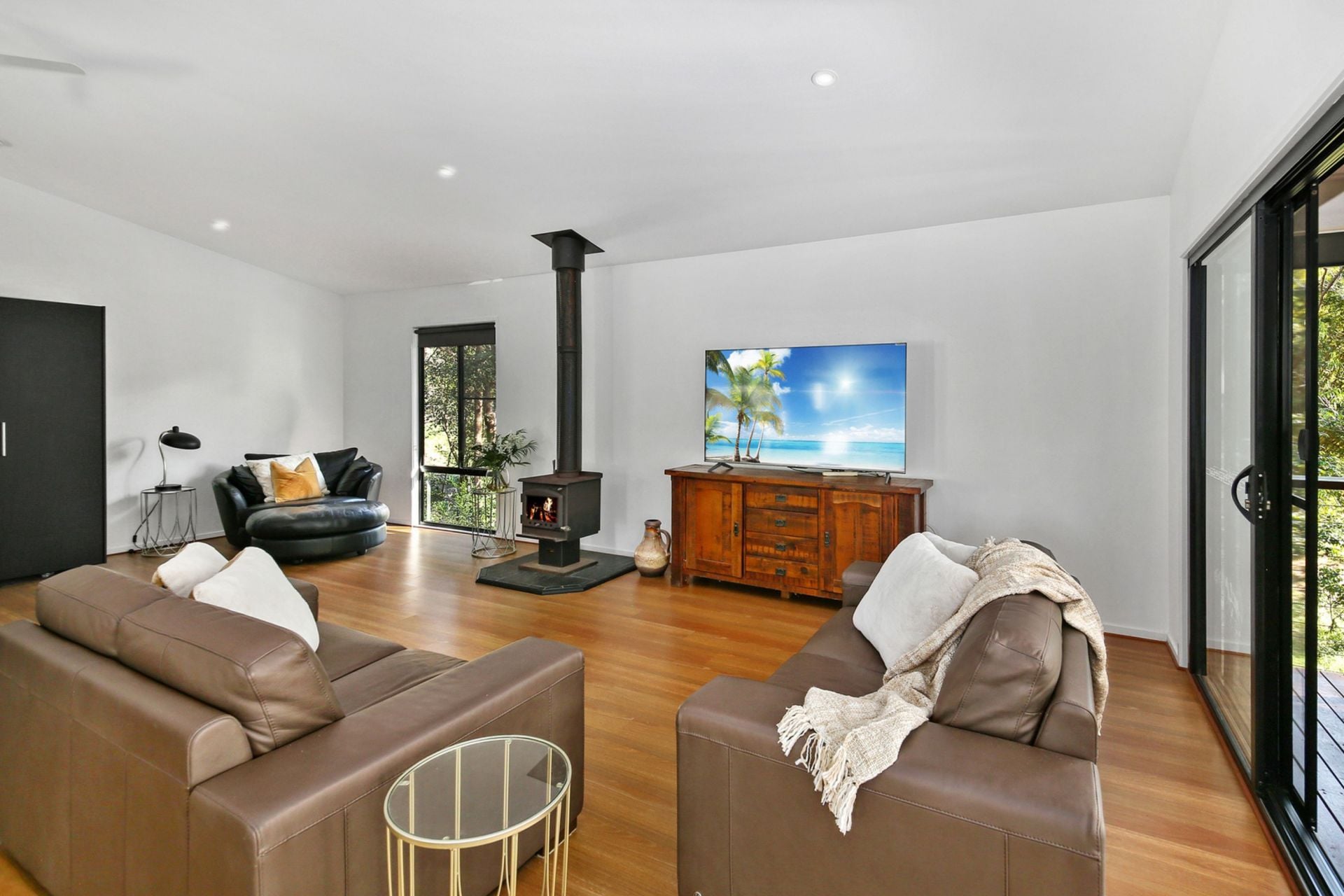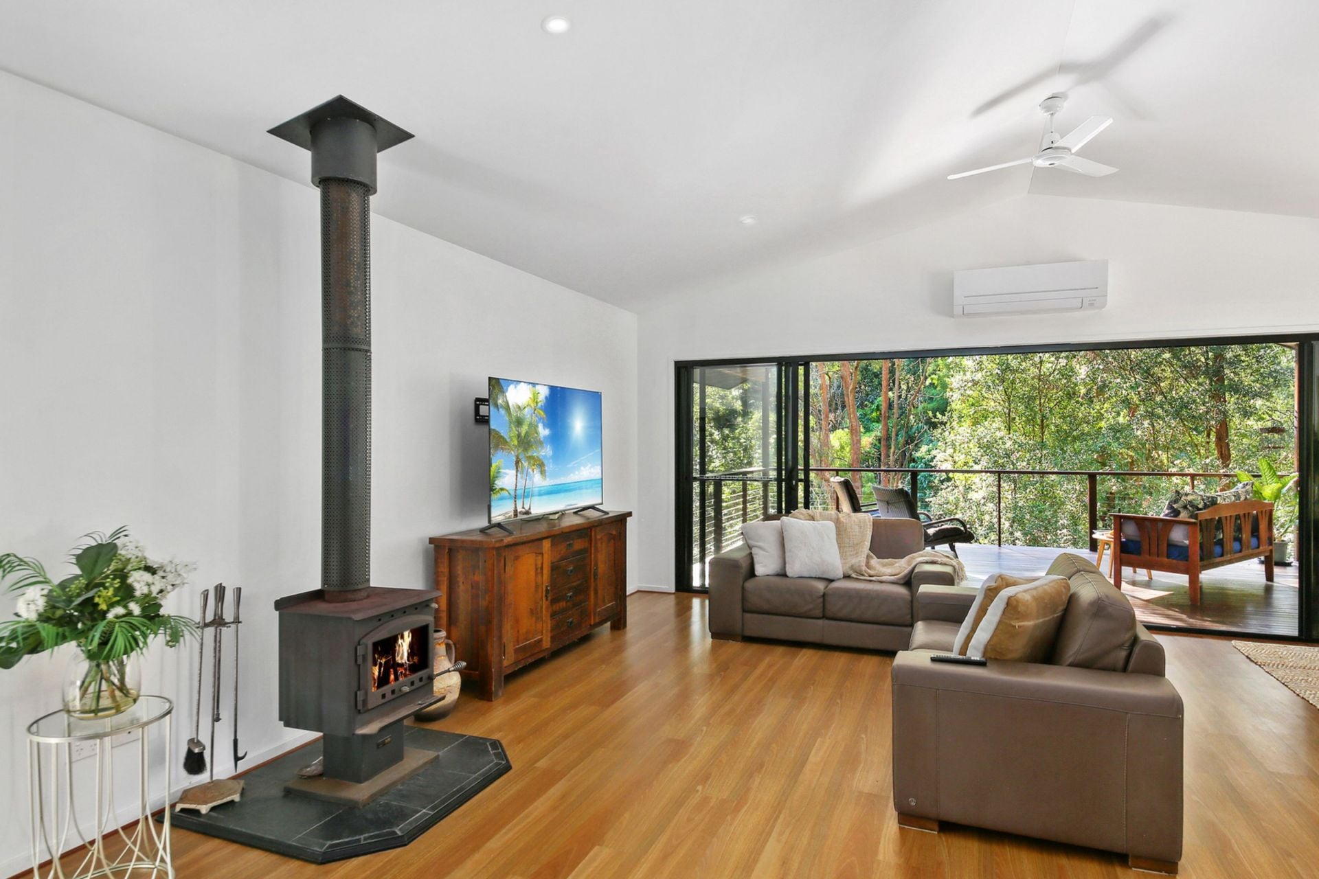 The main residence is perfectly positioned at an elevated and ultra-private site on the property: comprising three bedrooms, two bathrooms, modern light-filled kitchen, open plan living with fireplace, wraparound deck, separate laundry, and four vehicle-carport.