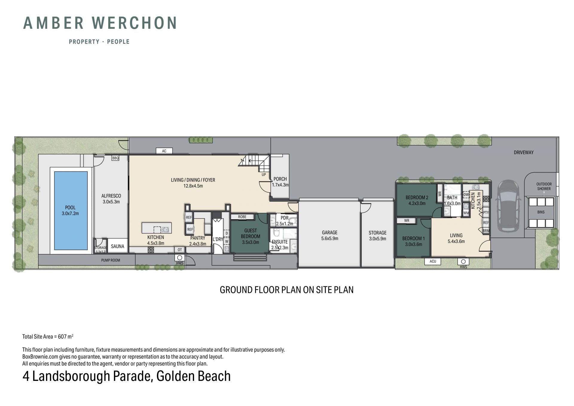 Across two levels covering approximately 354 square metres, the main residence comprises five bedrooms, three bathrooms plus powder room, two separate living areas, premium kitchen with Bosch appliances and butler's pantry, private poolside alfresco entertaining, separate laundry, and triple lock-up garage.