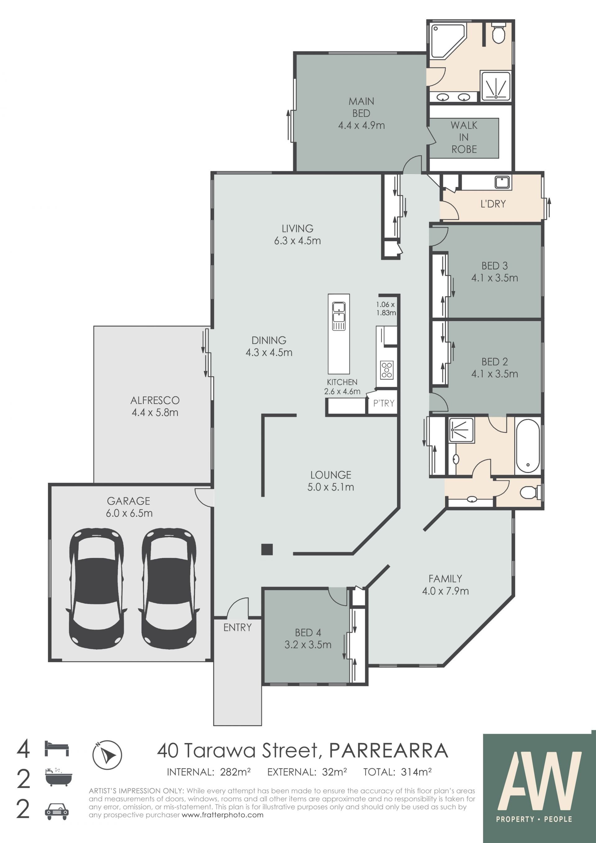 Across a single level, approximately 314m2 in total, the home comprises elegant formal entry, four bedrooms, two bathrooms, three separate living areas, central kitchen, north facing covered alfresco patio, separate laundry with external access, and double lock up garage, plus extra parking space on driveway for additional vehicles.