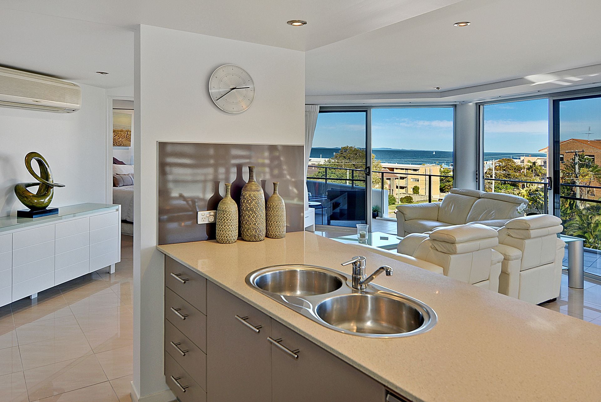 The wraparound balcony will undoubtedly be the most used space in the apartment; accessed from the living & dining room as well as master bedroom, this is the most inviting place to sit and soak up gentle sea breezes over a glass of chilled bubbles as you watch the ships slowly make their up or down the east coast. Can you just picture this?