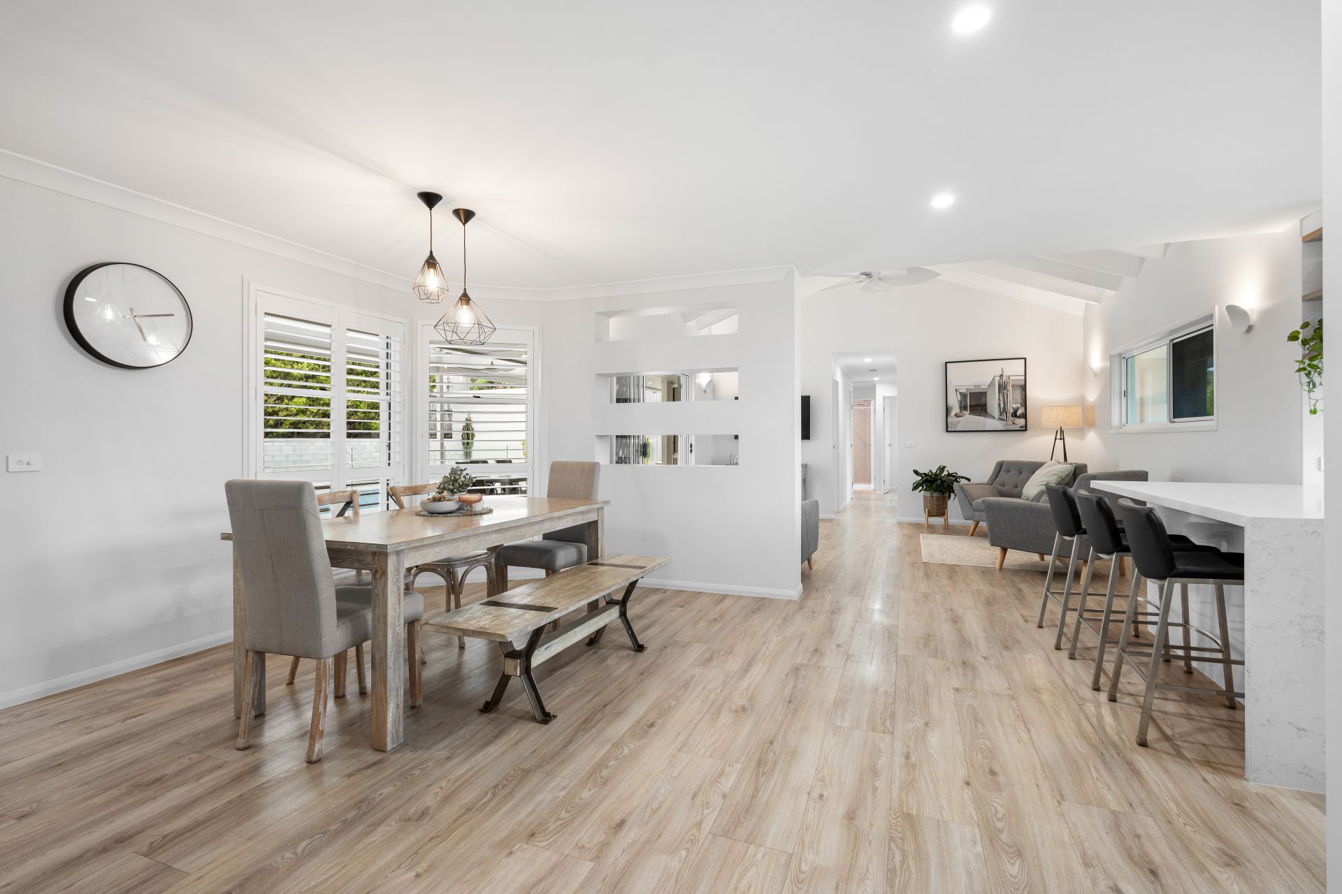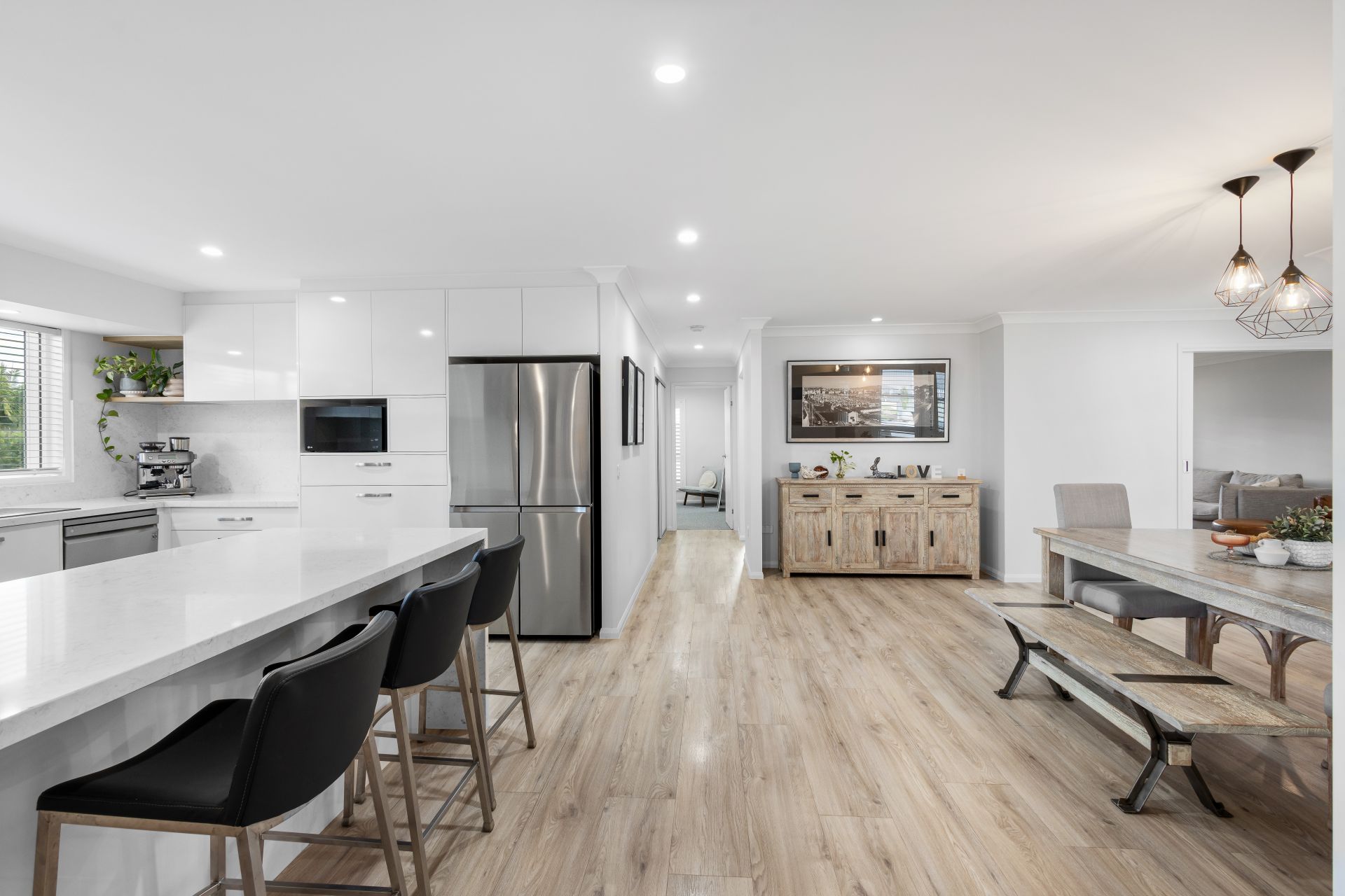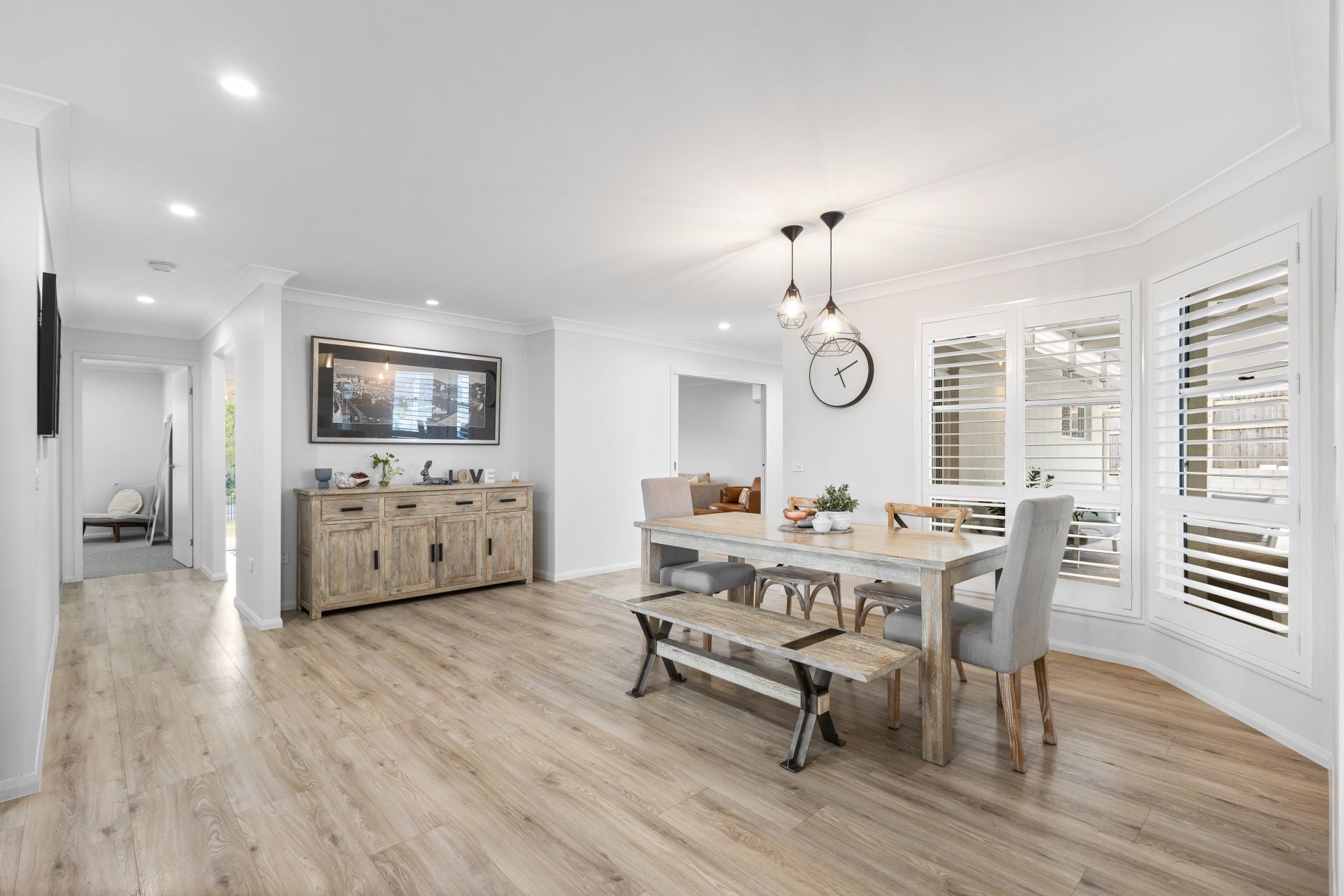 Living and dining areas flow seamlessly from the kitchen, offering multiple zones to relax, entertain or retreat. Timber-look vinyl flooring underfoot adds warmth and durability, while the thoughtful layout allows each space to feel distinct yet connected.