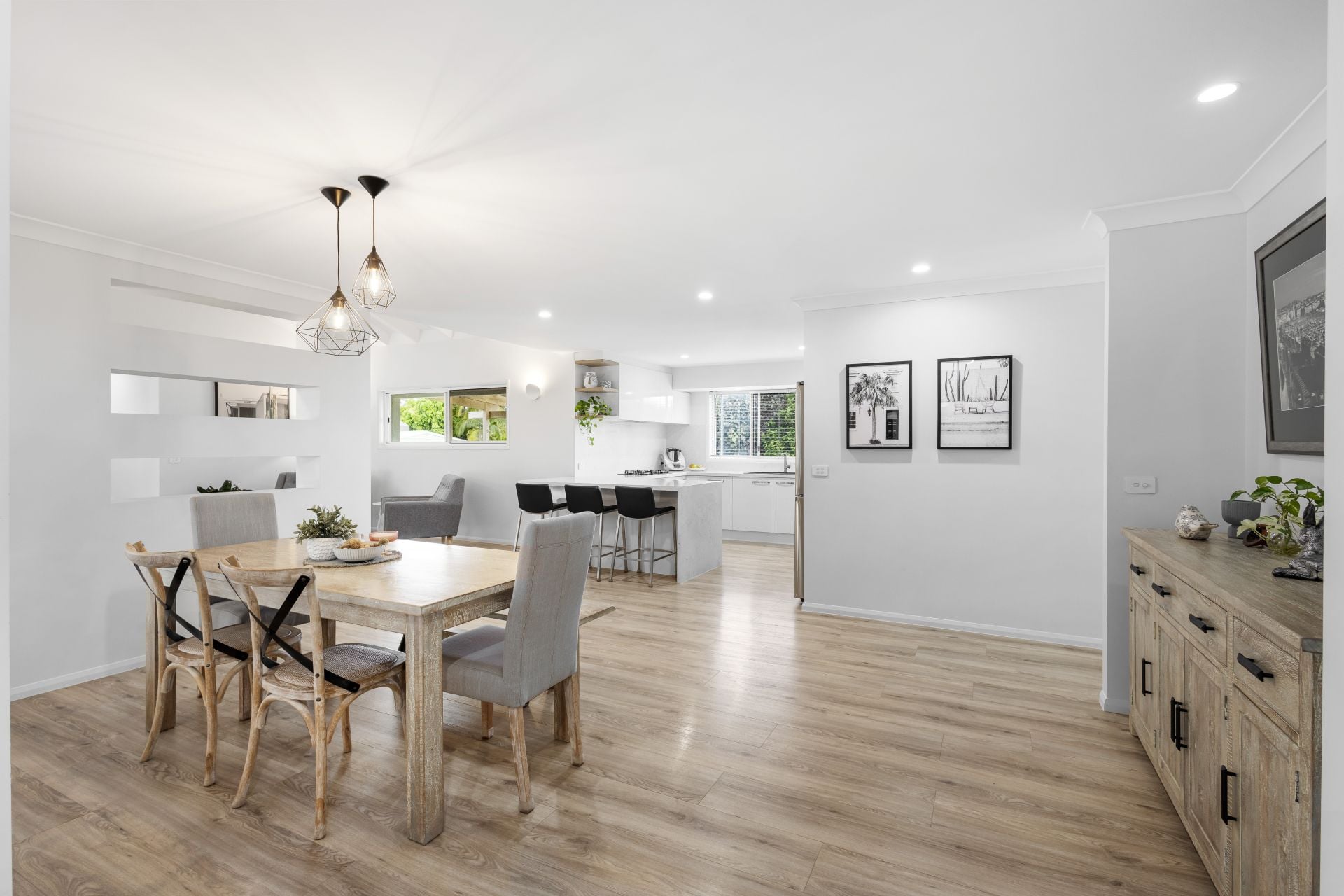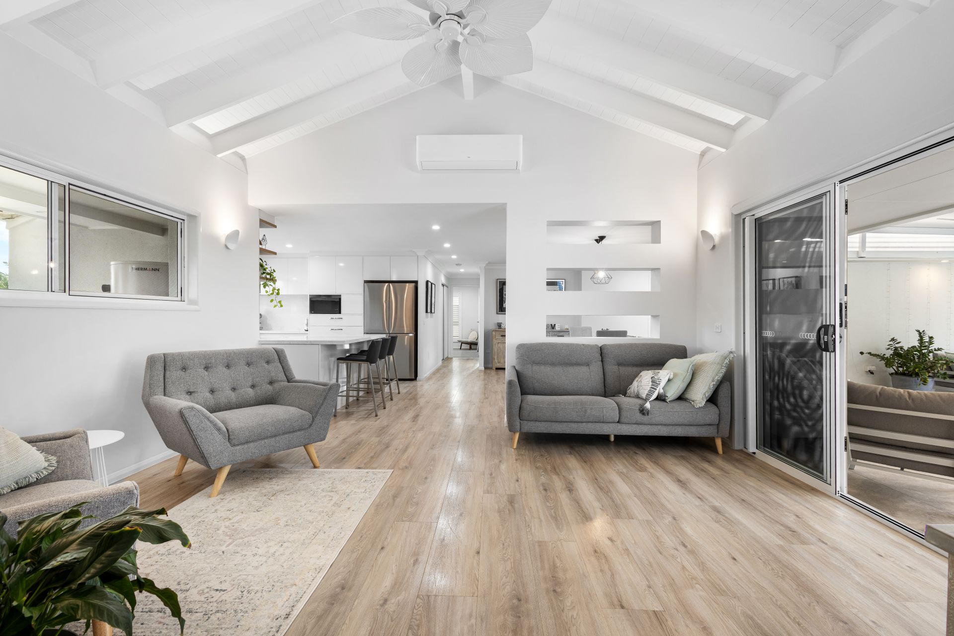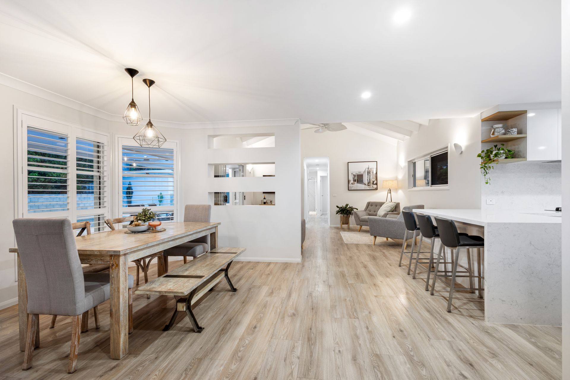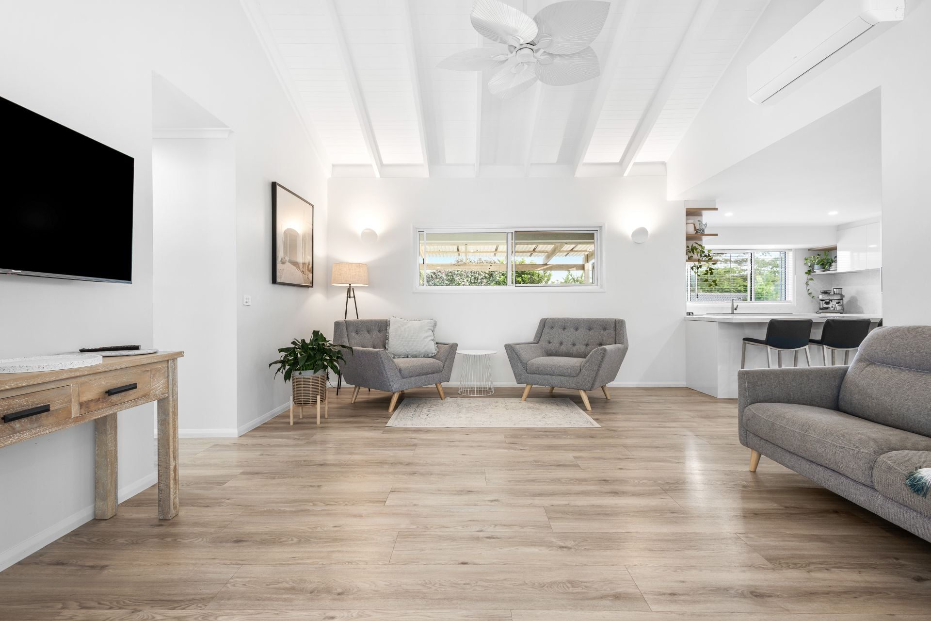 Living and dining areas flow seamlessly from the kitchen, offering multiple zones to relax, entertain or retreat. Timber-look vinyl flooring underfoot adds warmth and durability, while the thoughtful layout allows each space to feel distinct yet connected.
