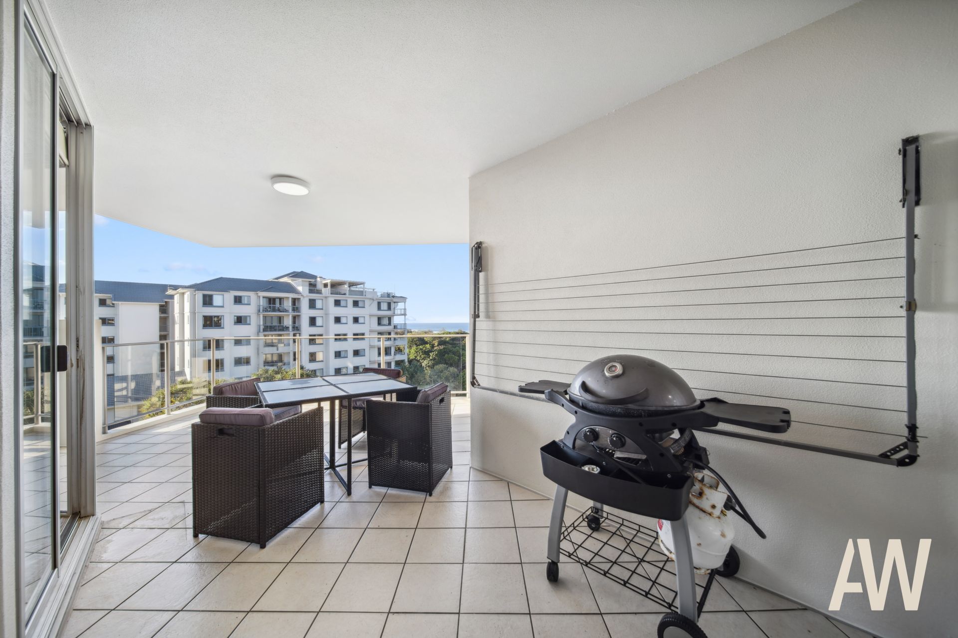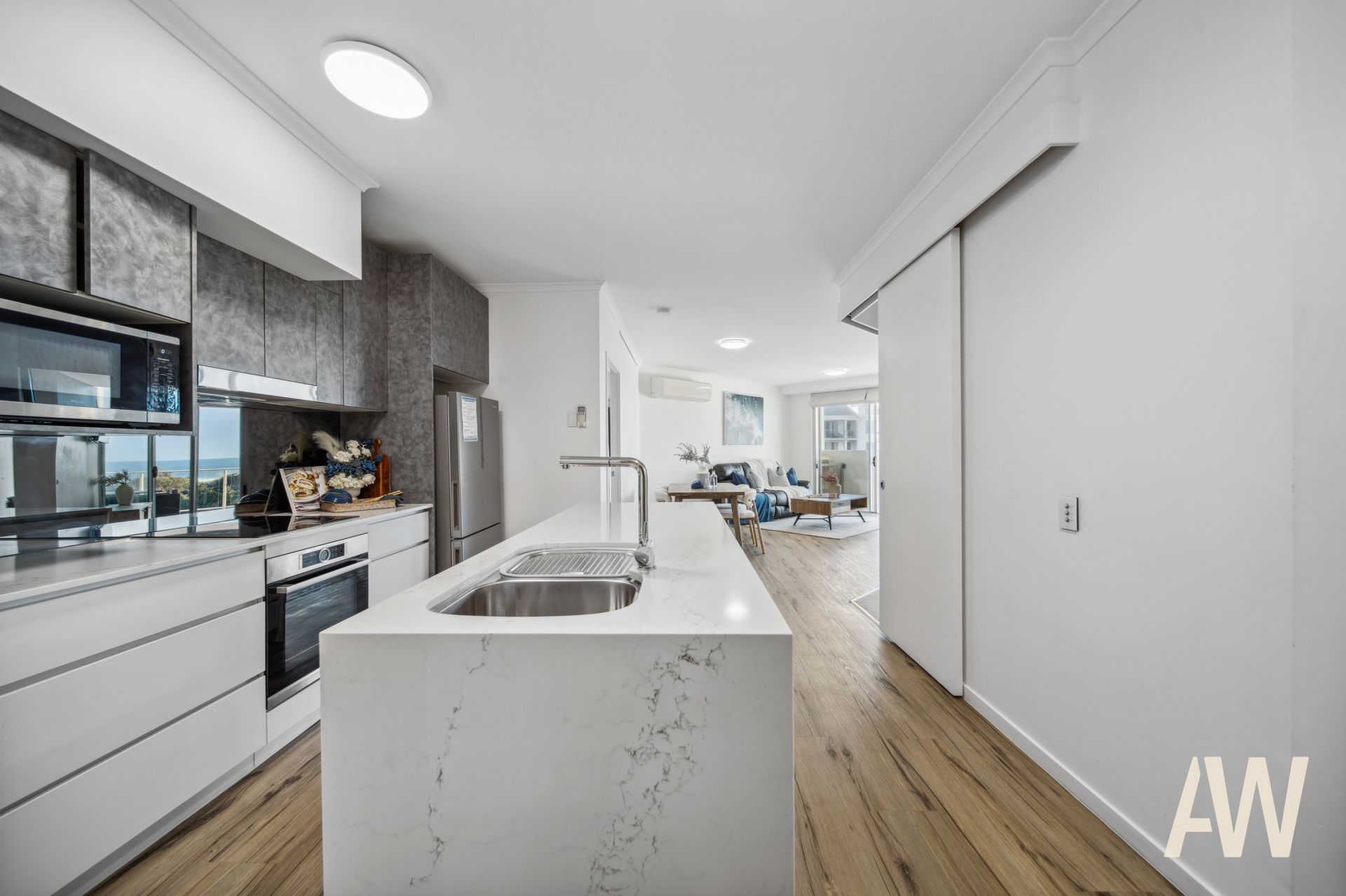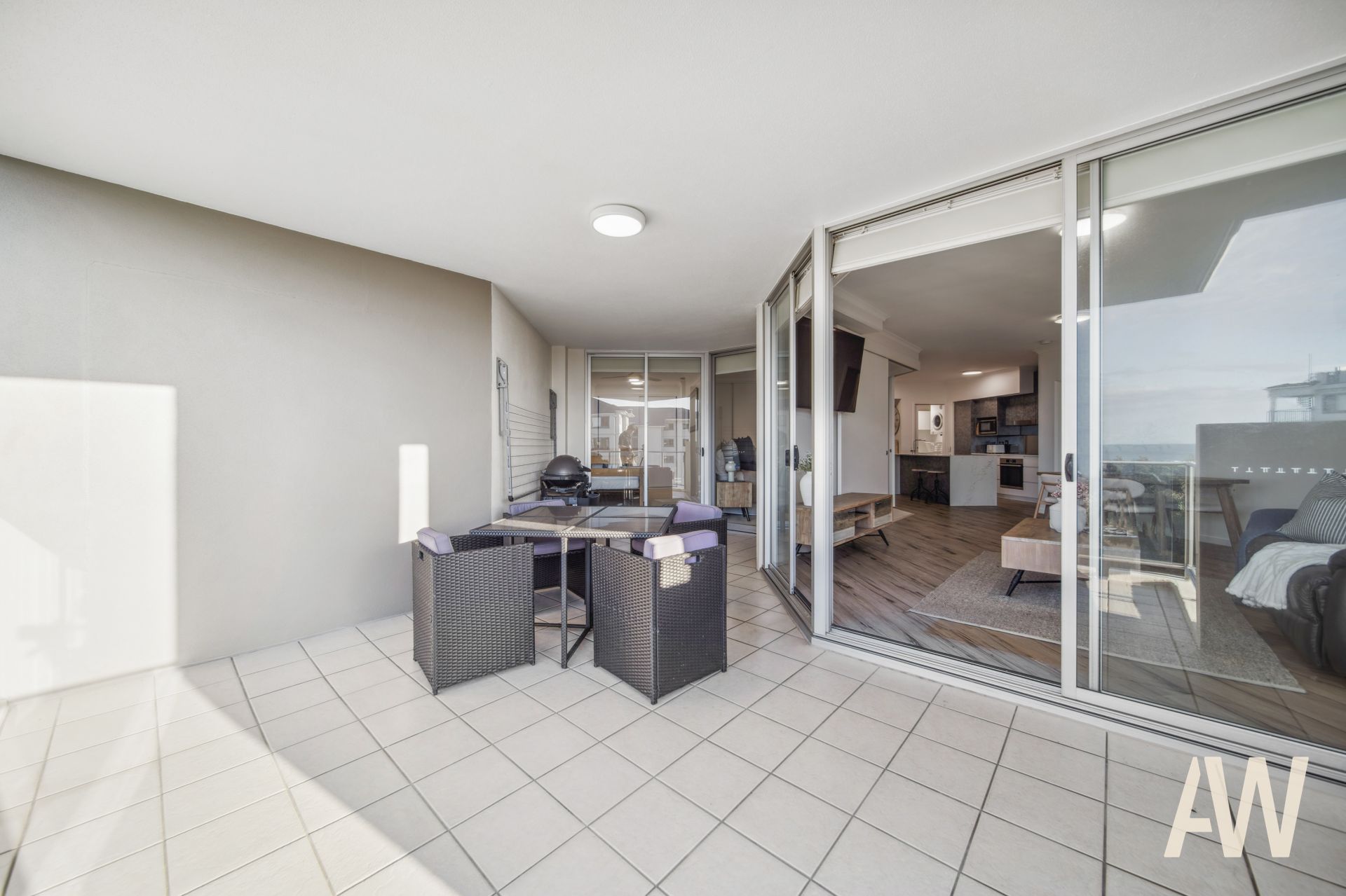 Light-filled throughout, it comprises three bedrooms, two fully tiled bathrooms, elegant galley kitchen, open plan living, private balcony off master, covered balcony off living and remaining bedrooms, and compact laundry. It also offers two secure side-by-side carparks.