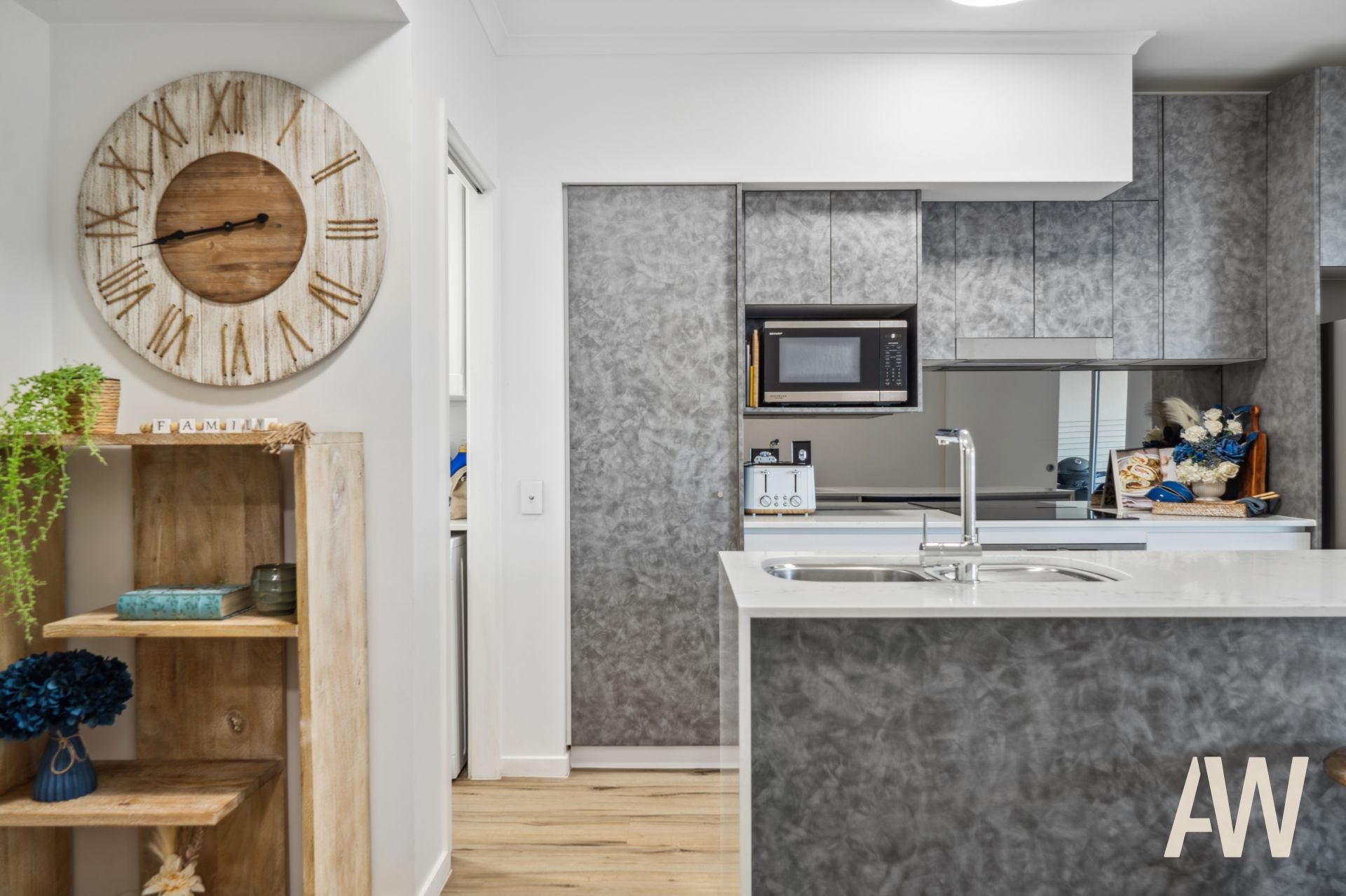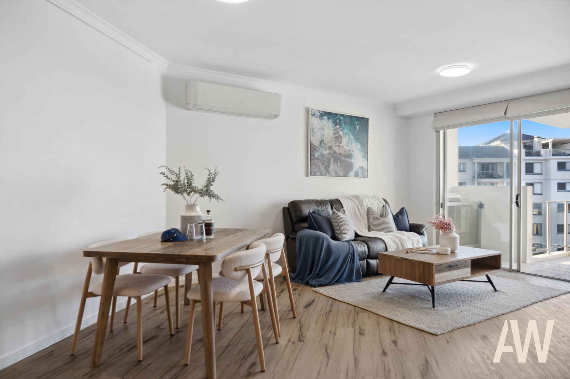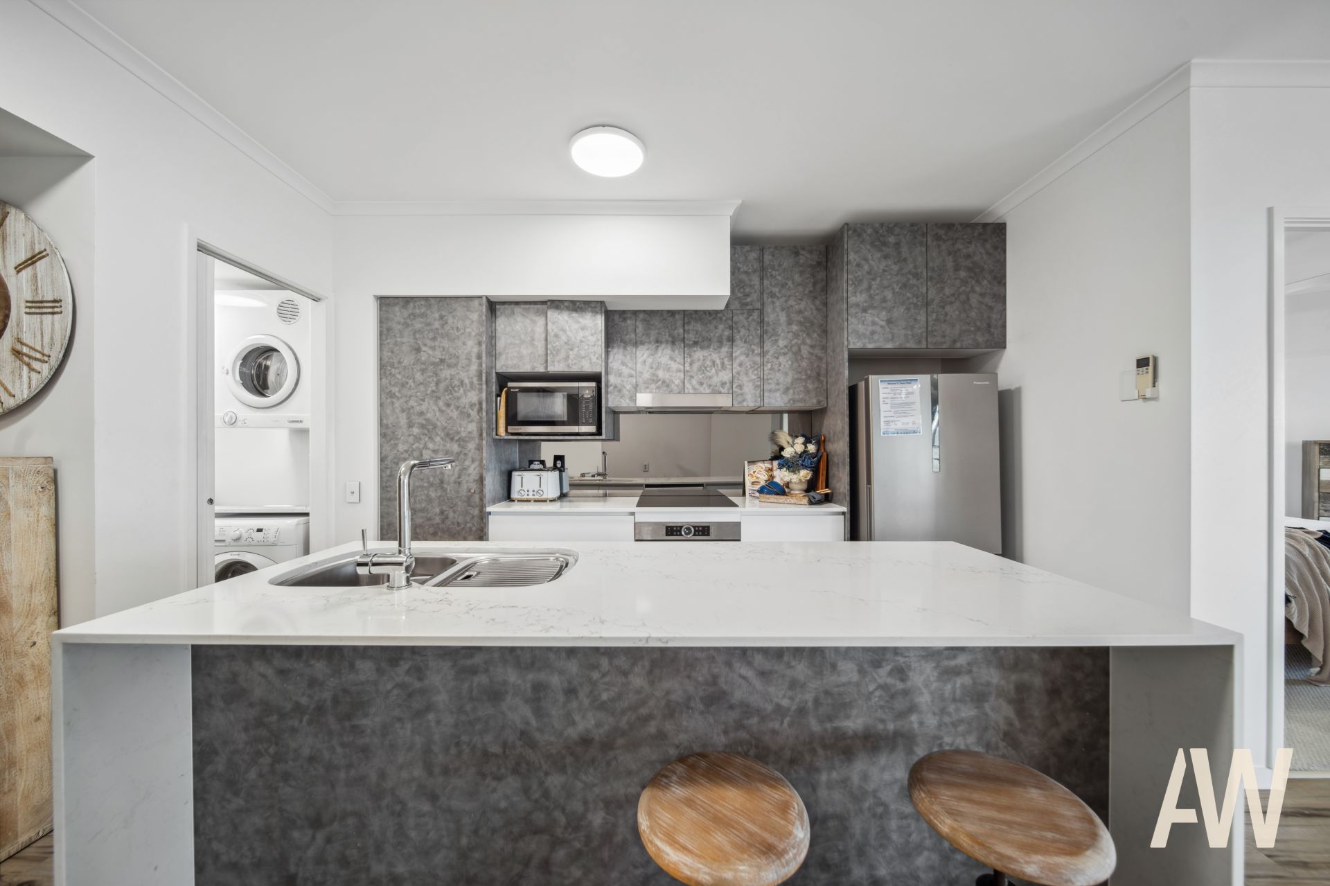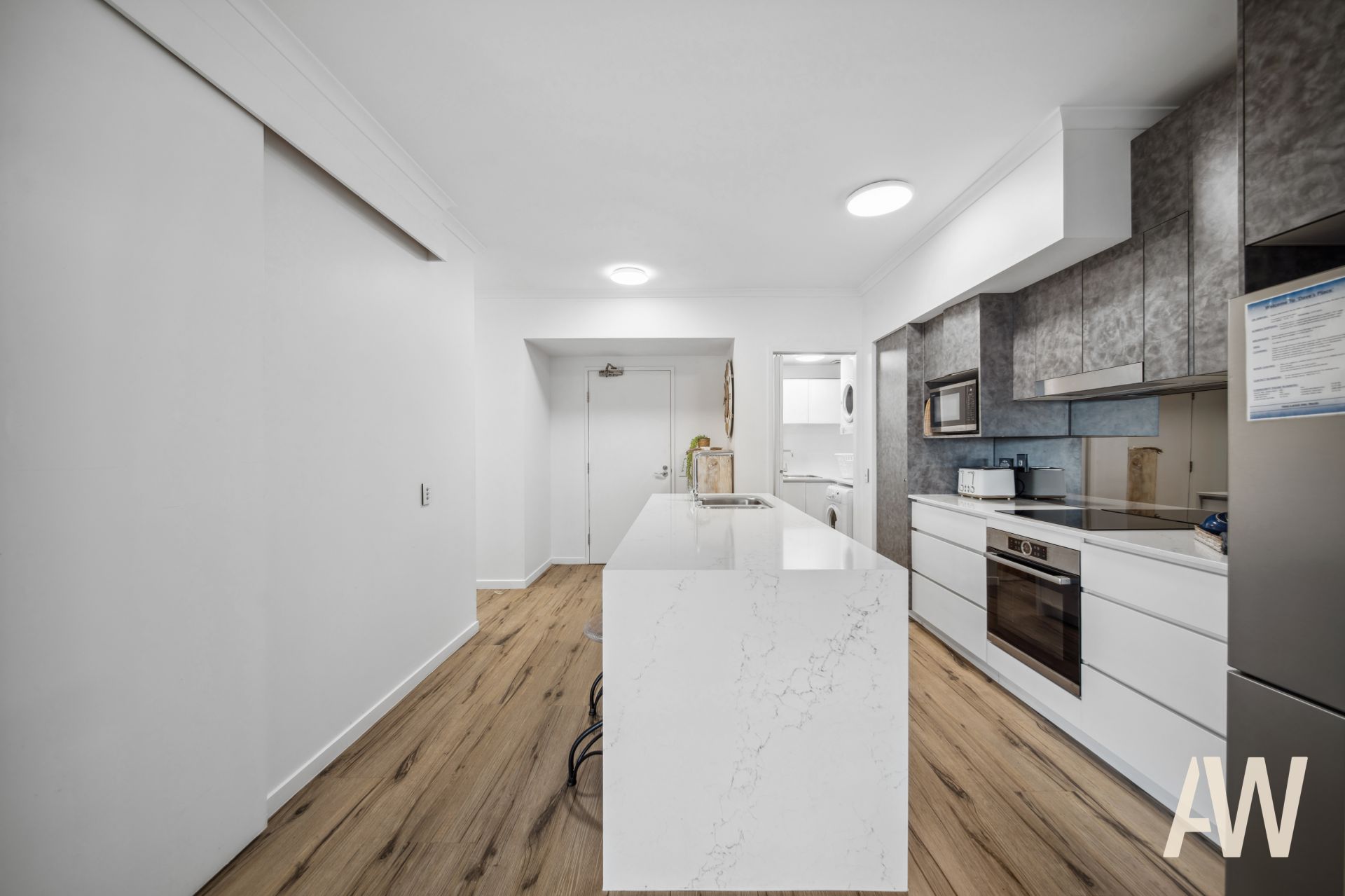 Light-filled throughout, it comprises three bedrooms, two fully tiled bathrooms, elegant galley kitchen, open plan living, private balcony off master, covered balcony off living and remaining bedrooms, and compact laundry. It also offers two secure side-by-side carparks.