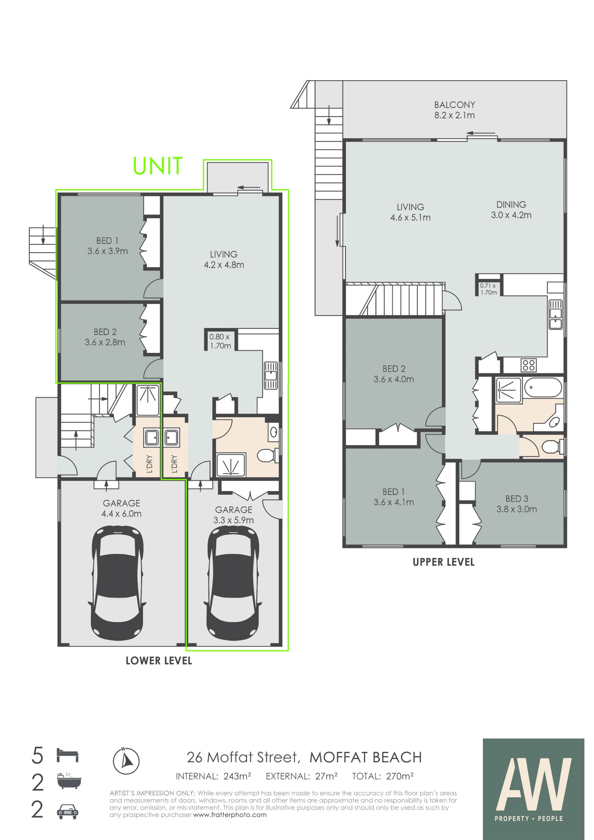 Its upper light-filled, north-facing, open plan unit with three bedrooms, one bathroom and garaged car space instantly offers the opportunity to start a life in relaxed Moffat Beach, to generate rental income or to recreate your dream space. While the lower unit is perfect for the renovator aficionado.