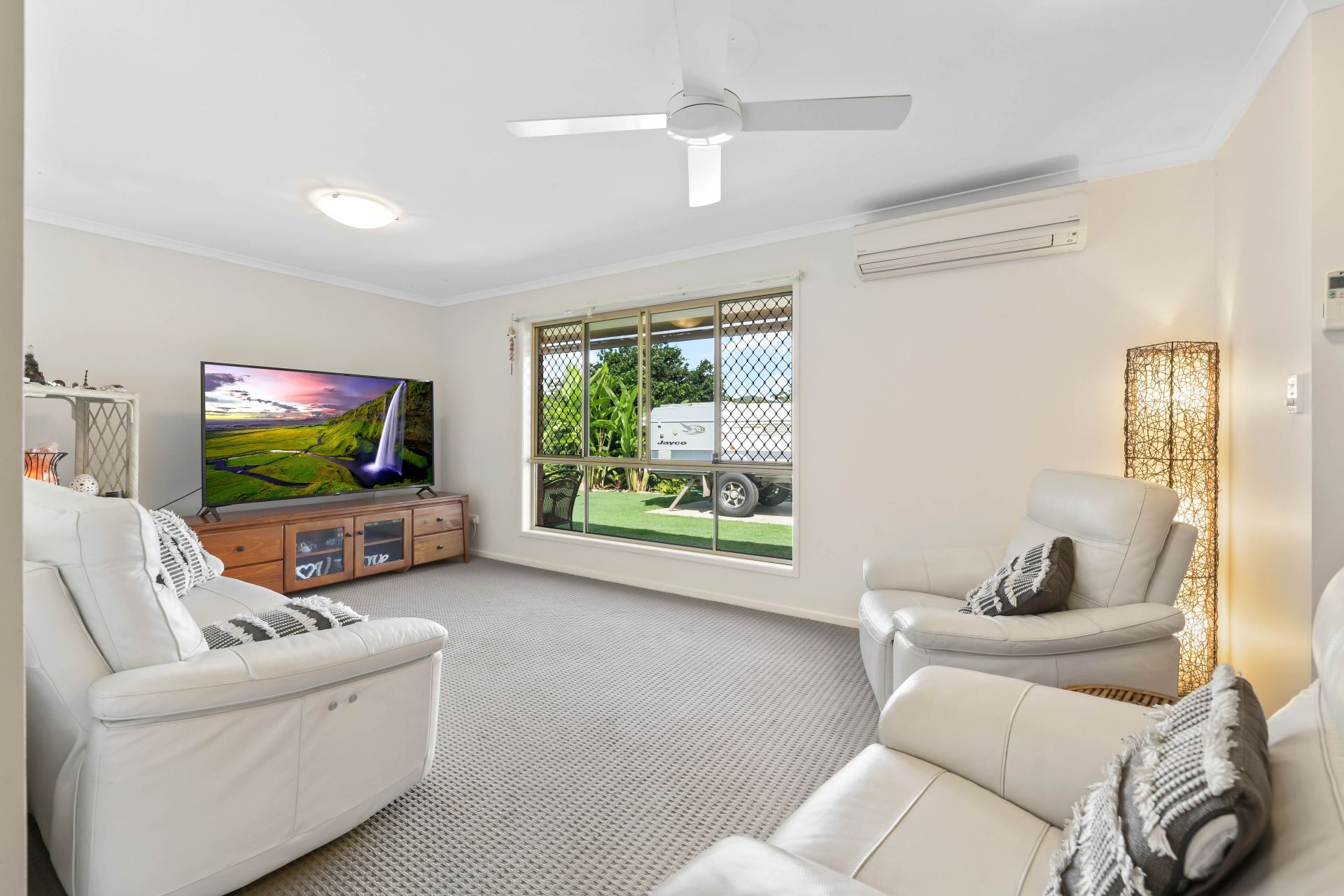 Inside features include split system air-conditioned lounge and dining areas and a centrally located kitchen with servery access to the large outdoor patio area. There are four good-sized bedrooms with ceiling fans and the master has air conditioning, ensuite and built-ins. Completing the inside is a separate toilet and a neat and tidy bathroom with shower and good size bath. The outdoor patio has high quality screens which enables the area to be enclosed.