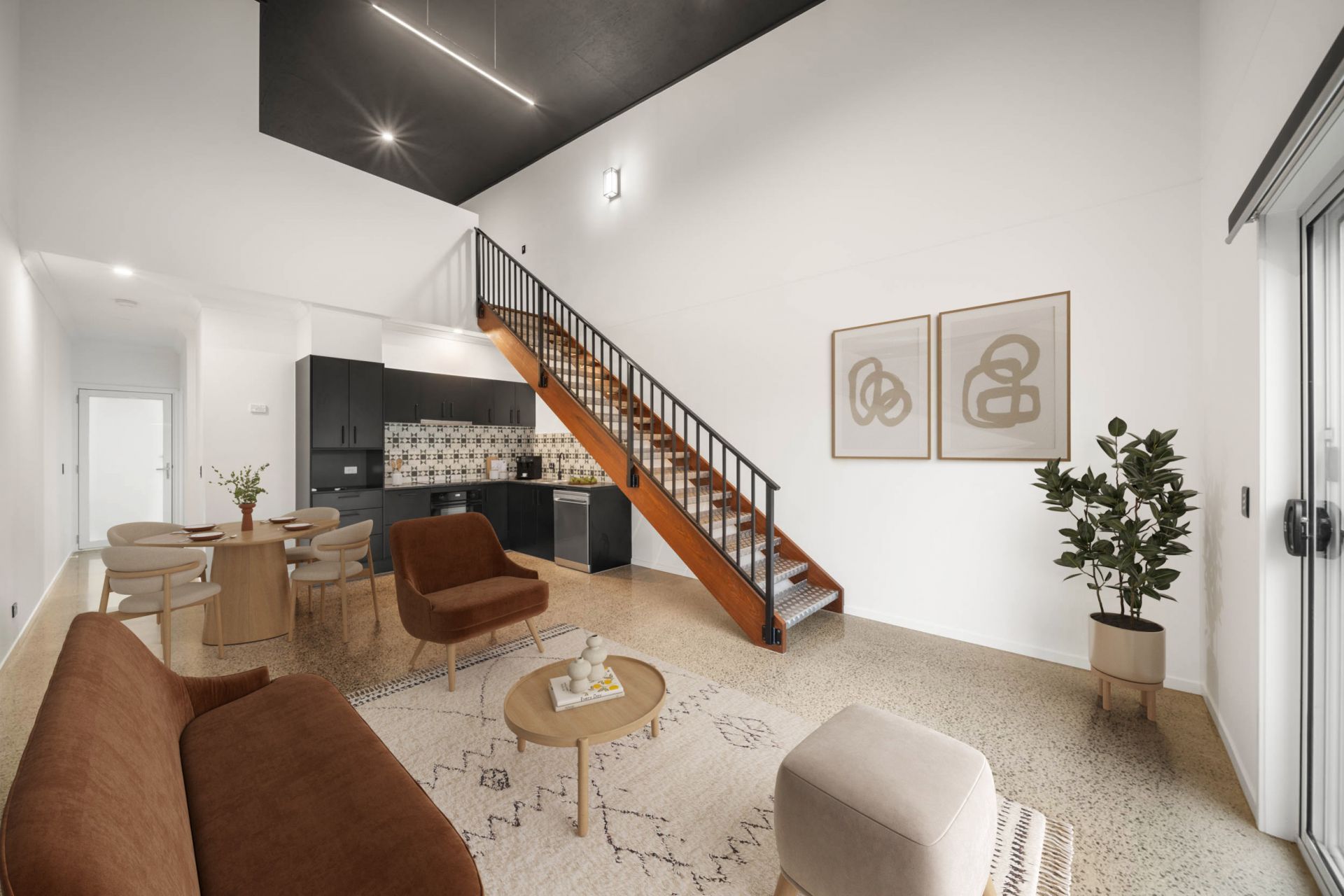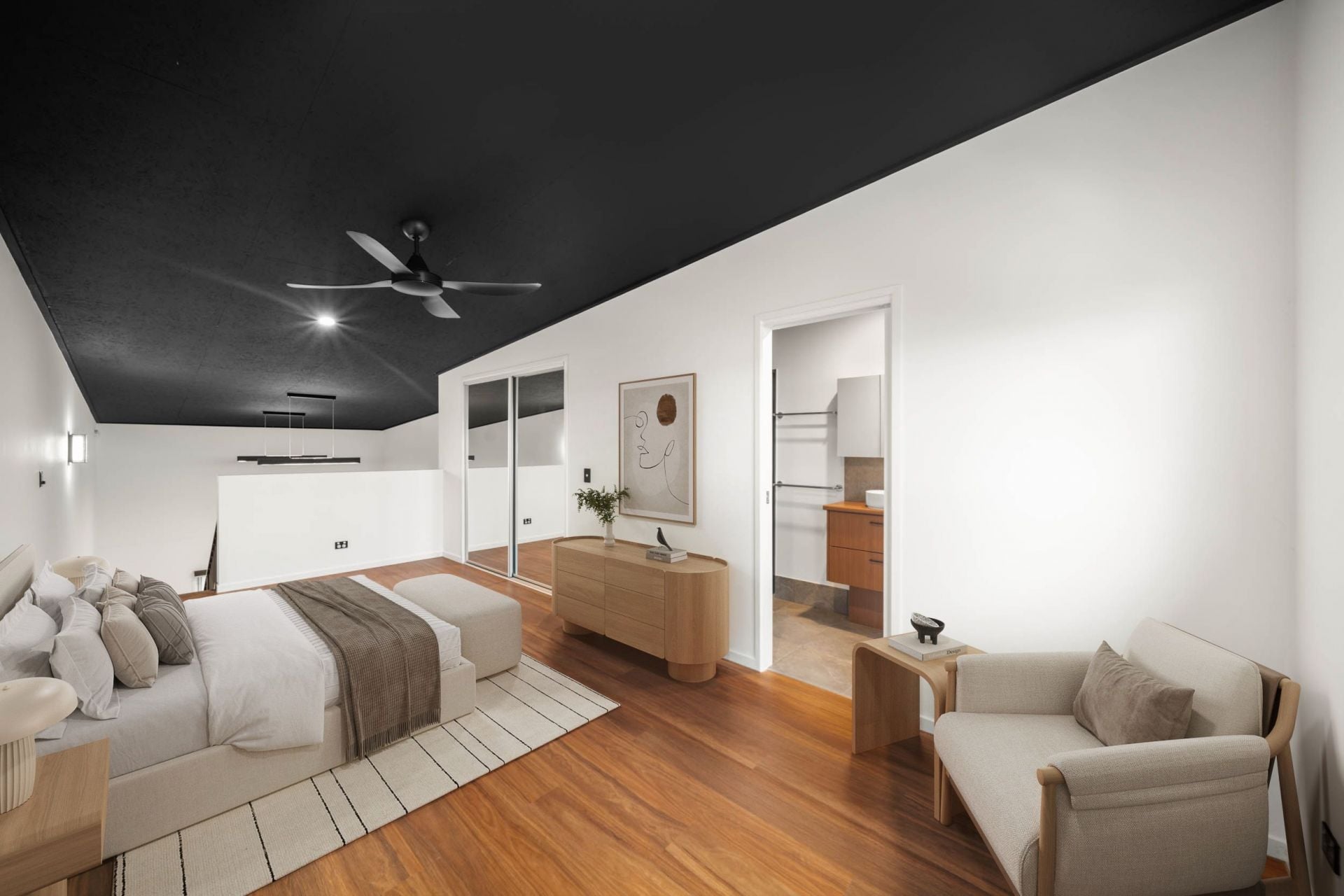 Upstairs is dedicated to the master retreat. The main bedroom features a walk-in wardrobe and private ensuite, creating a comfortable and secluded haven. An open void overlooking the living area enhances the sense of space and allows light to filter throughout the home.
