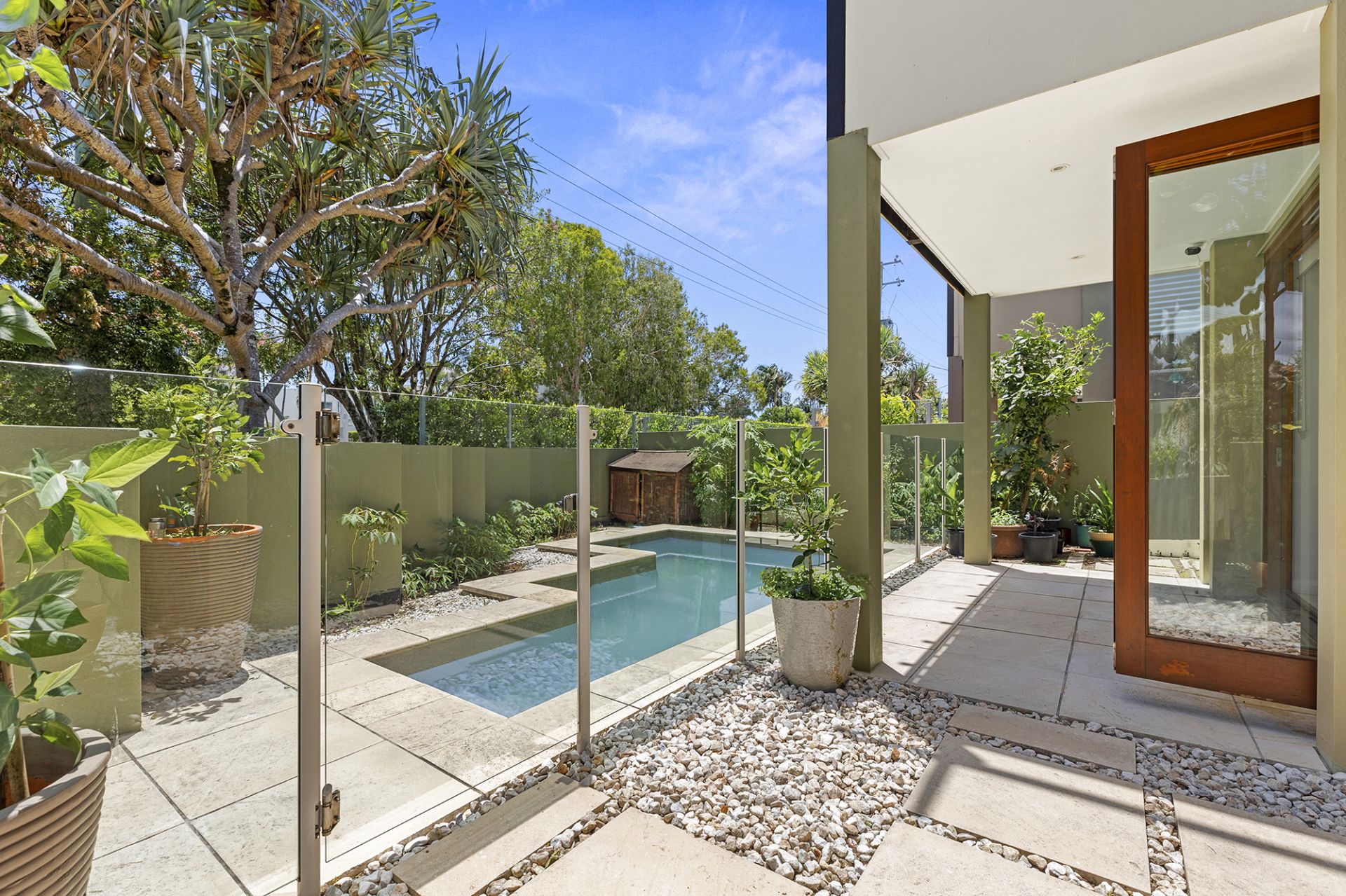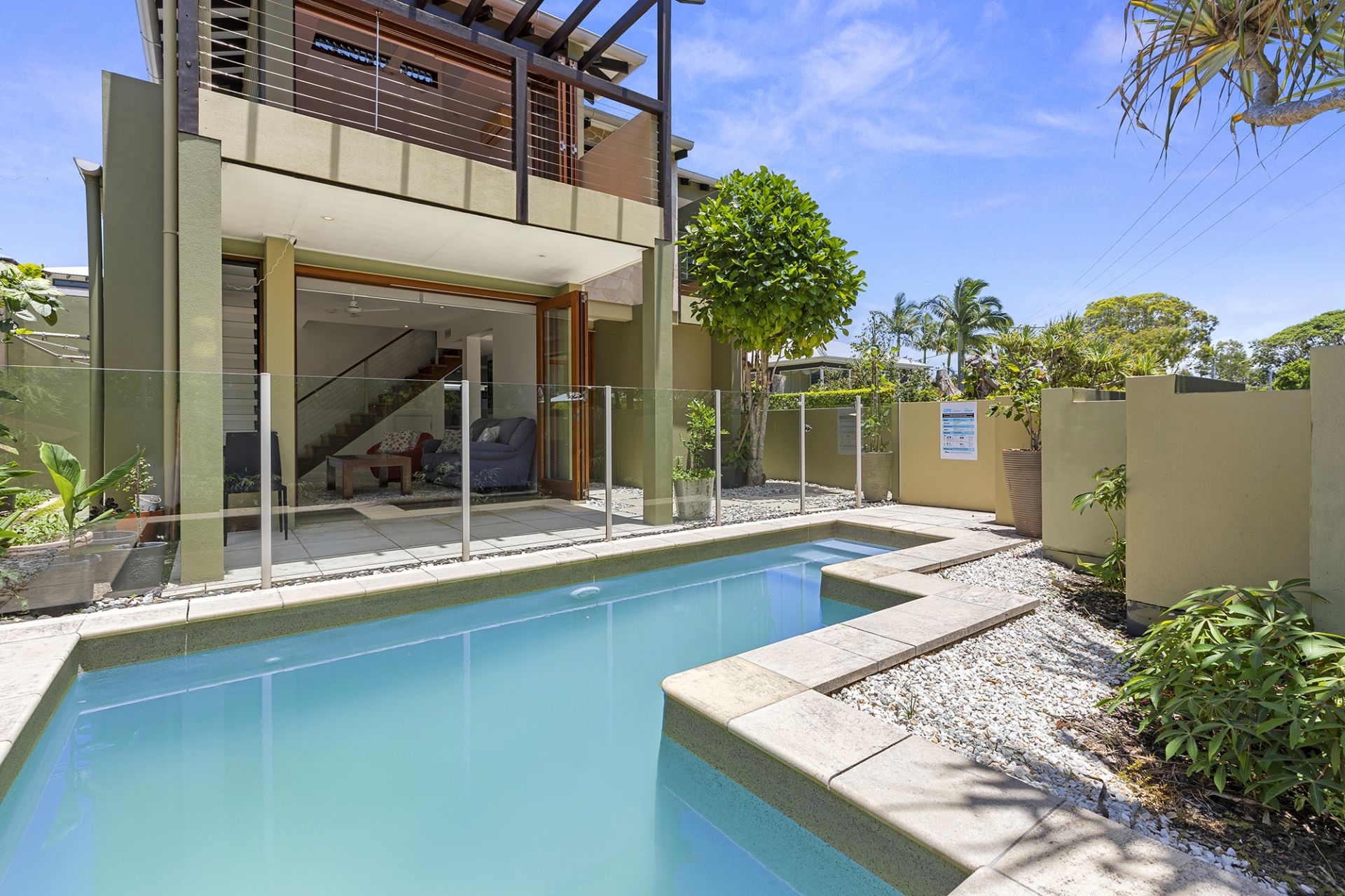Across two light-filled levels, the home comprises three bedrooms – each with their own exclusive balcony, two fully tiled bathrooms, powder room, built-in study nook, generous sized quality kitchen, expansive living/dining flowing out to wraparound courtyard and north facing terrace with sundrenched inground pool, and double lock up garage with laundry facilities.