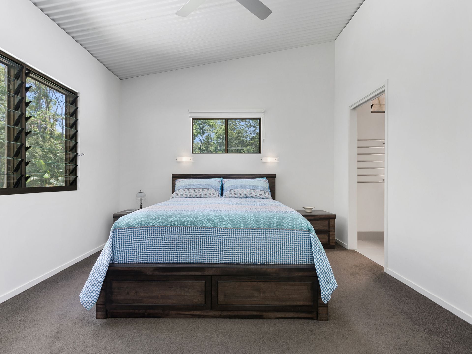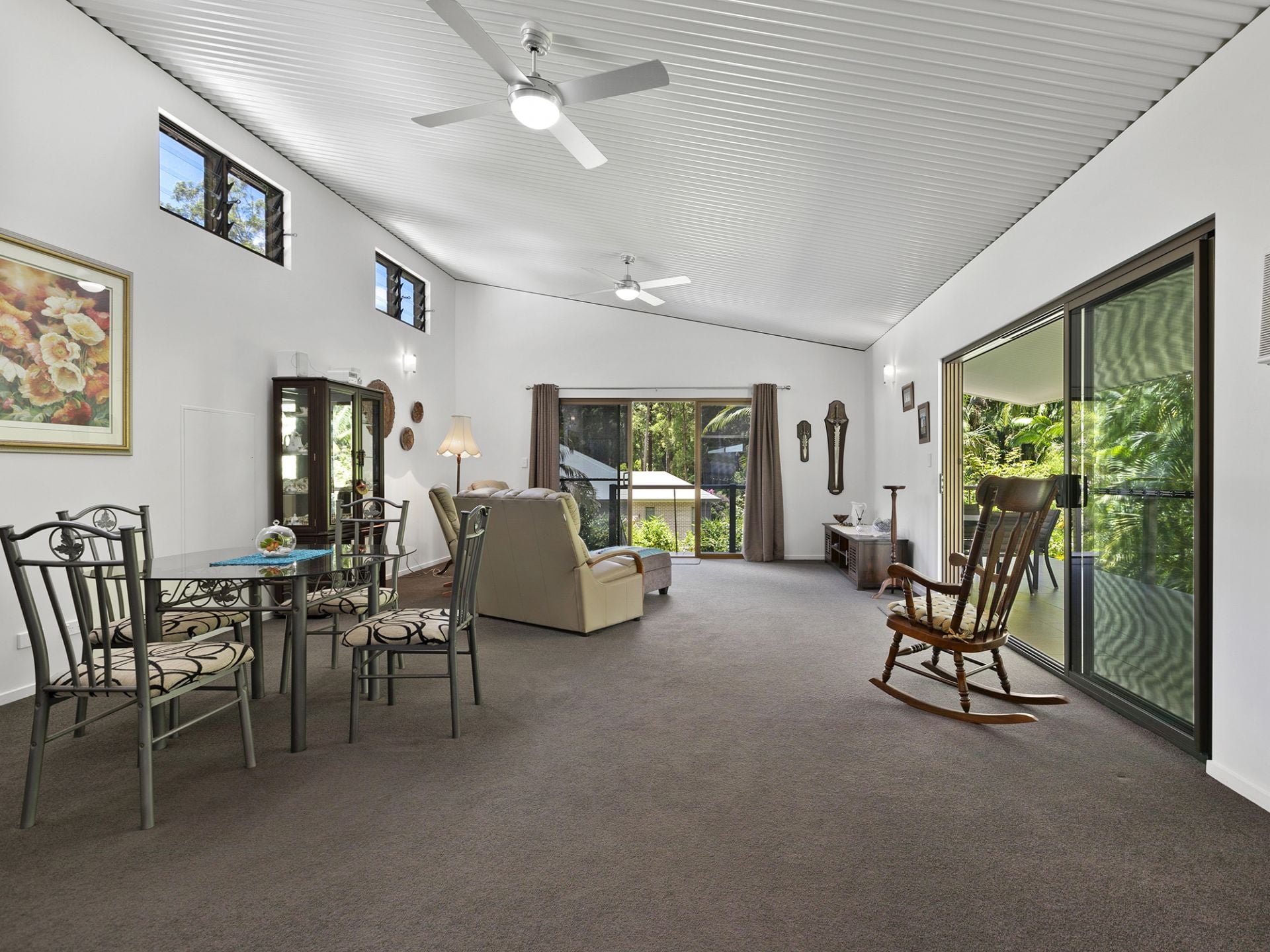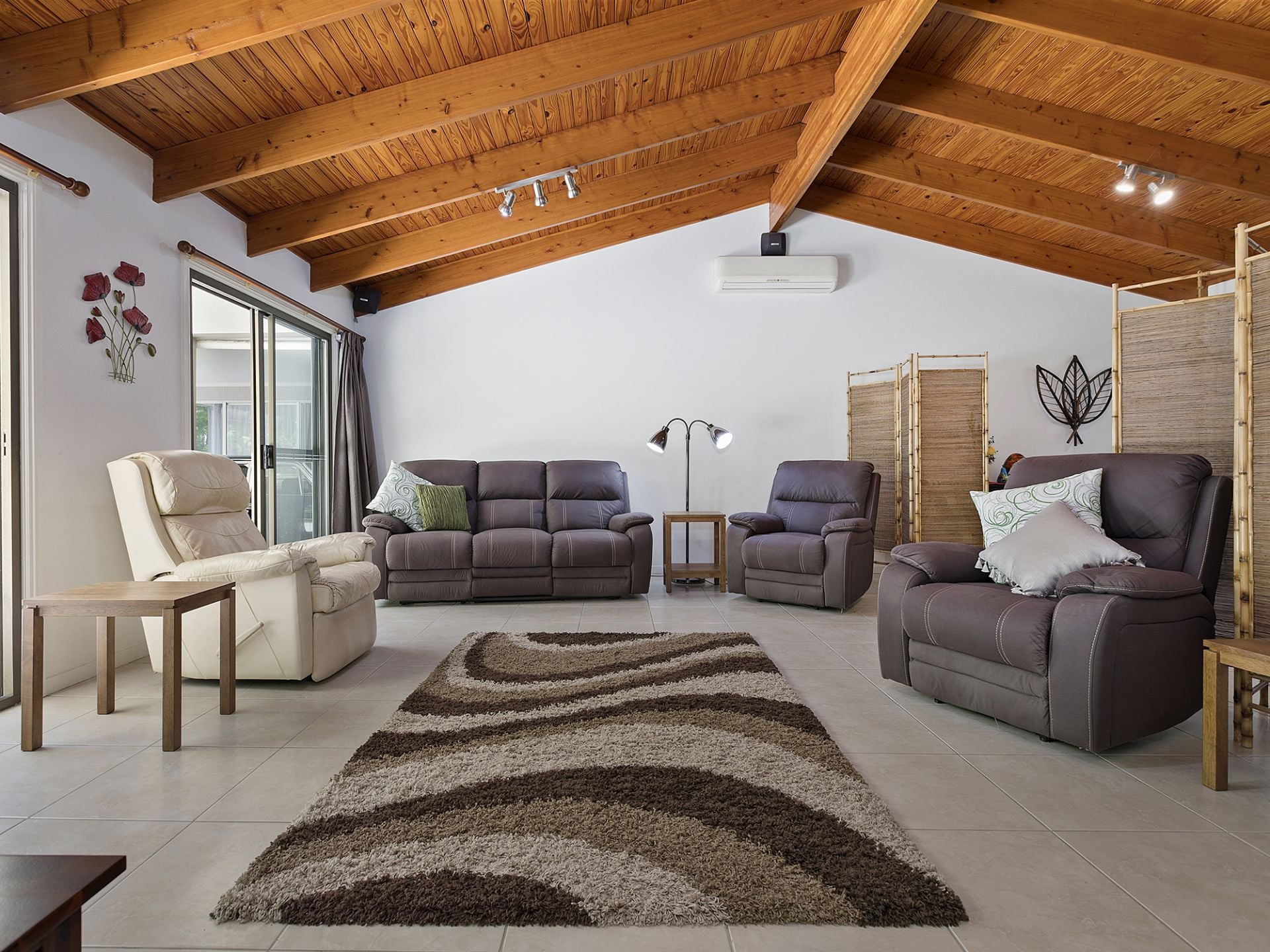 Step through the bespoke timber front door and you will immediately appreciate the sense of space and serenity here. The main living area with its dramatically high timber cathedral ceilings, cool colour scheme and fireplace flows out to the patio and gardens. There is also a split system air-conditioner to keep you warm in winter and cool in summer!