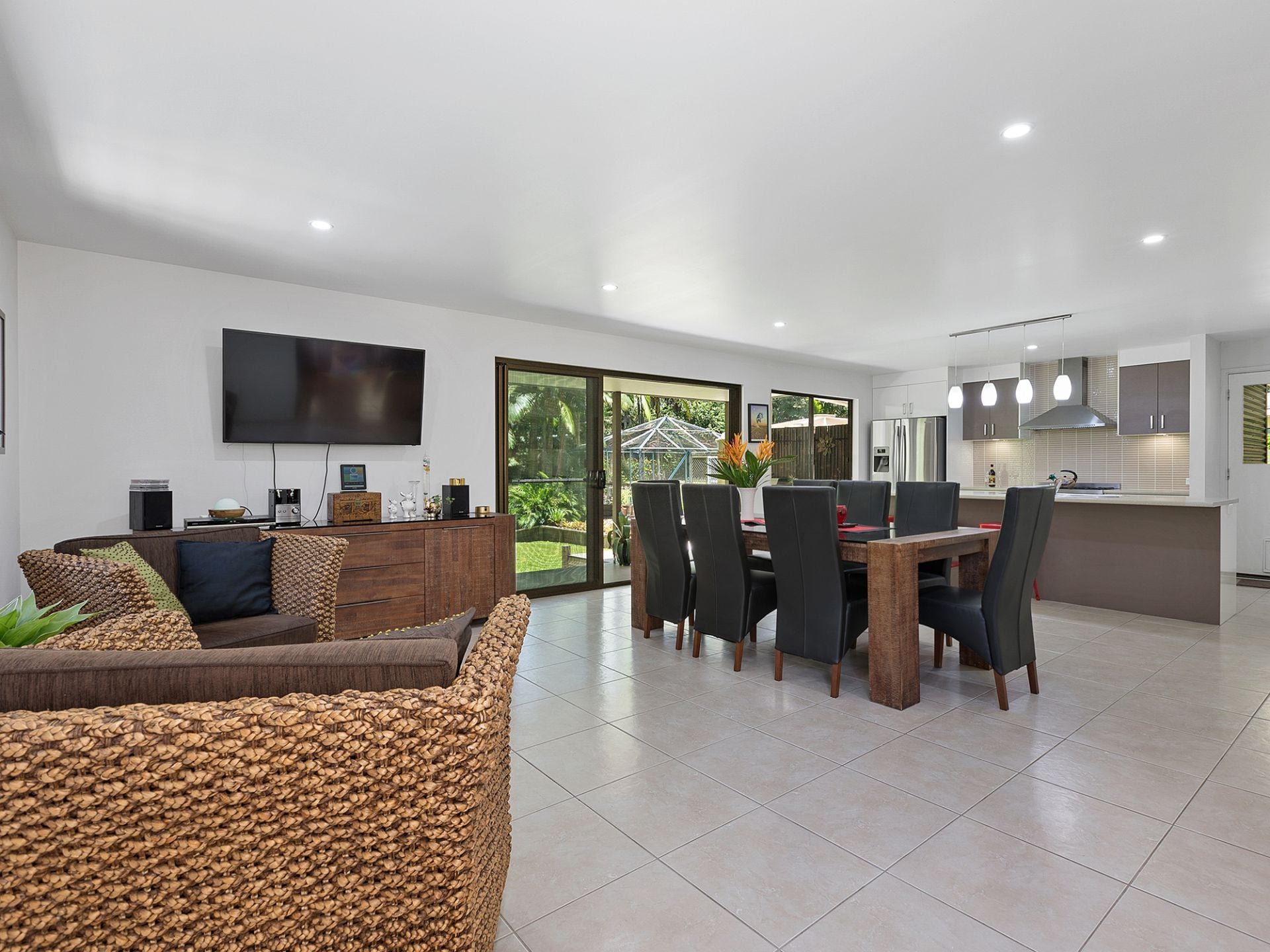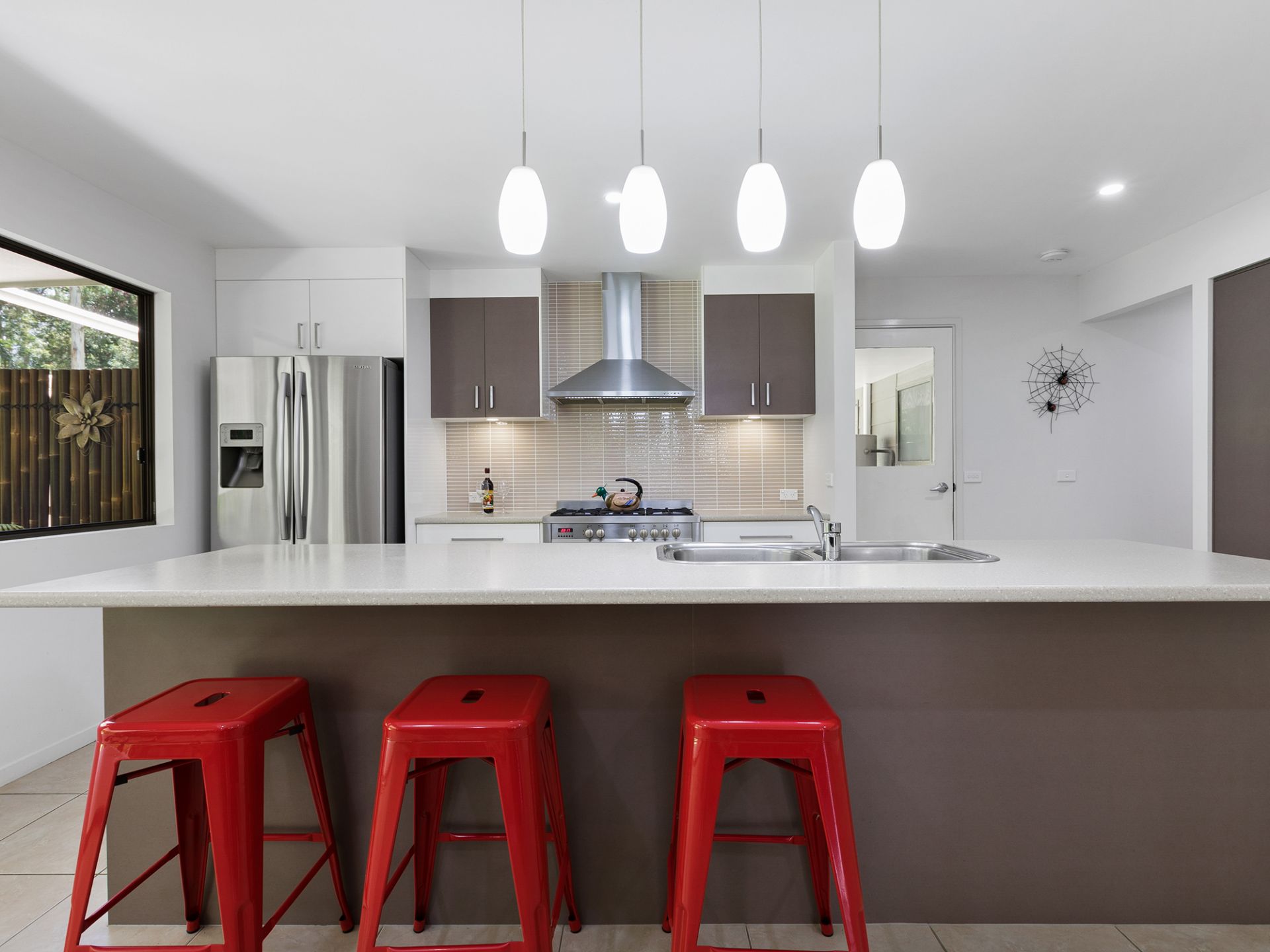 Head to the kitchen where you will find another open plan living and dining space. The kitchen showcases stone benchtops, gas stove, pendant lighting, statement backsplash and a large island bench with room for seating. This area also leads out to the yard.