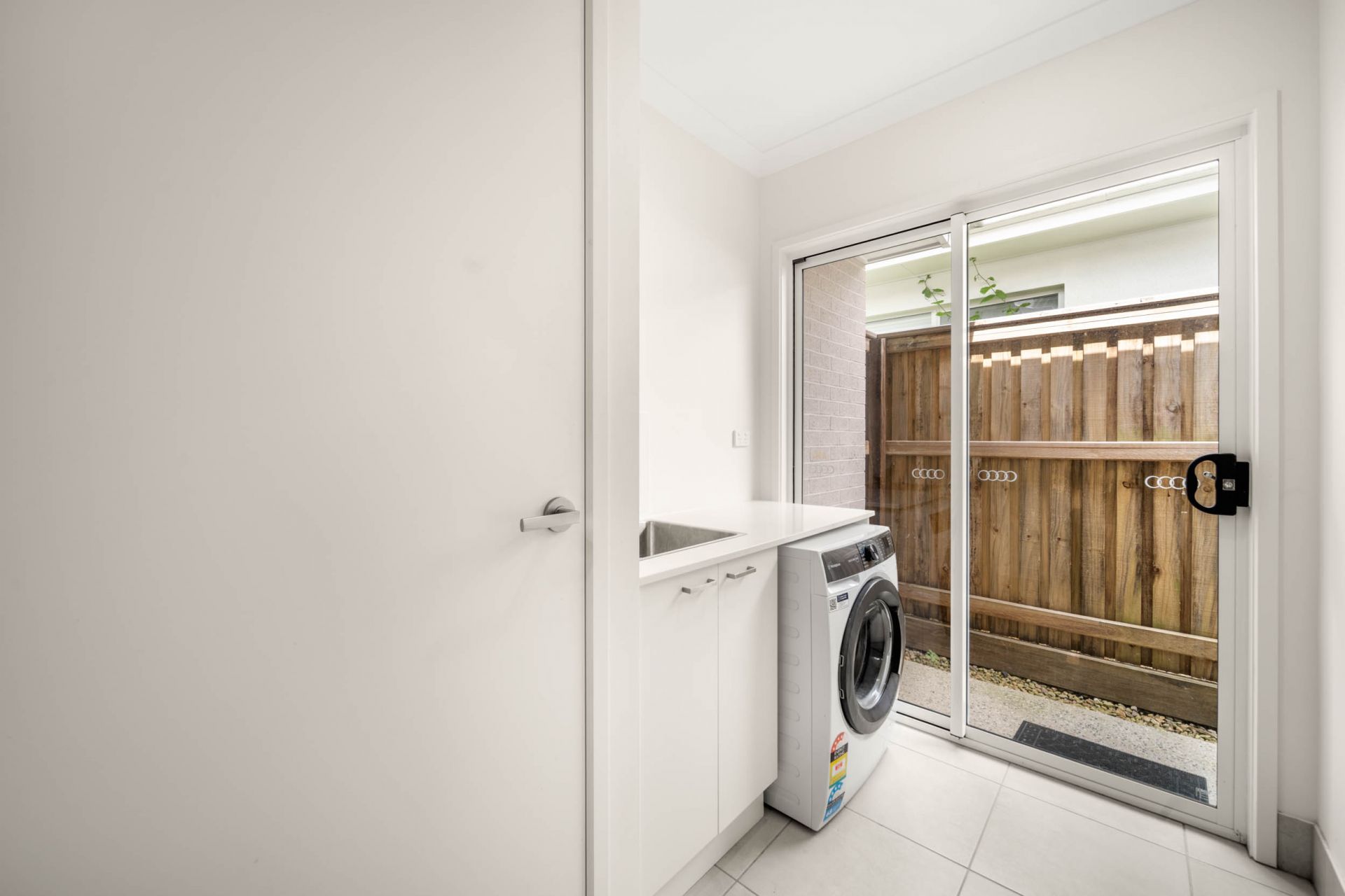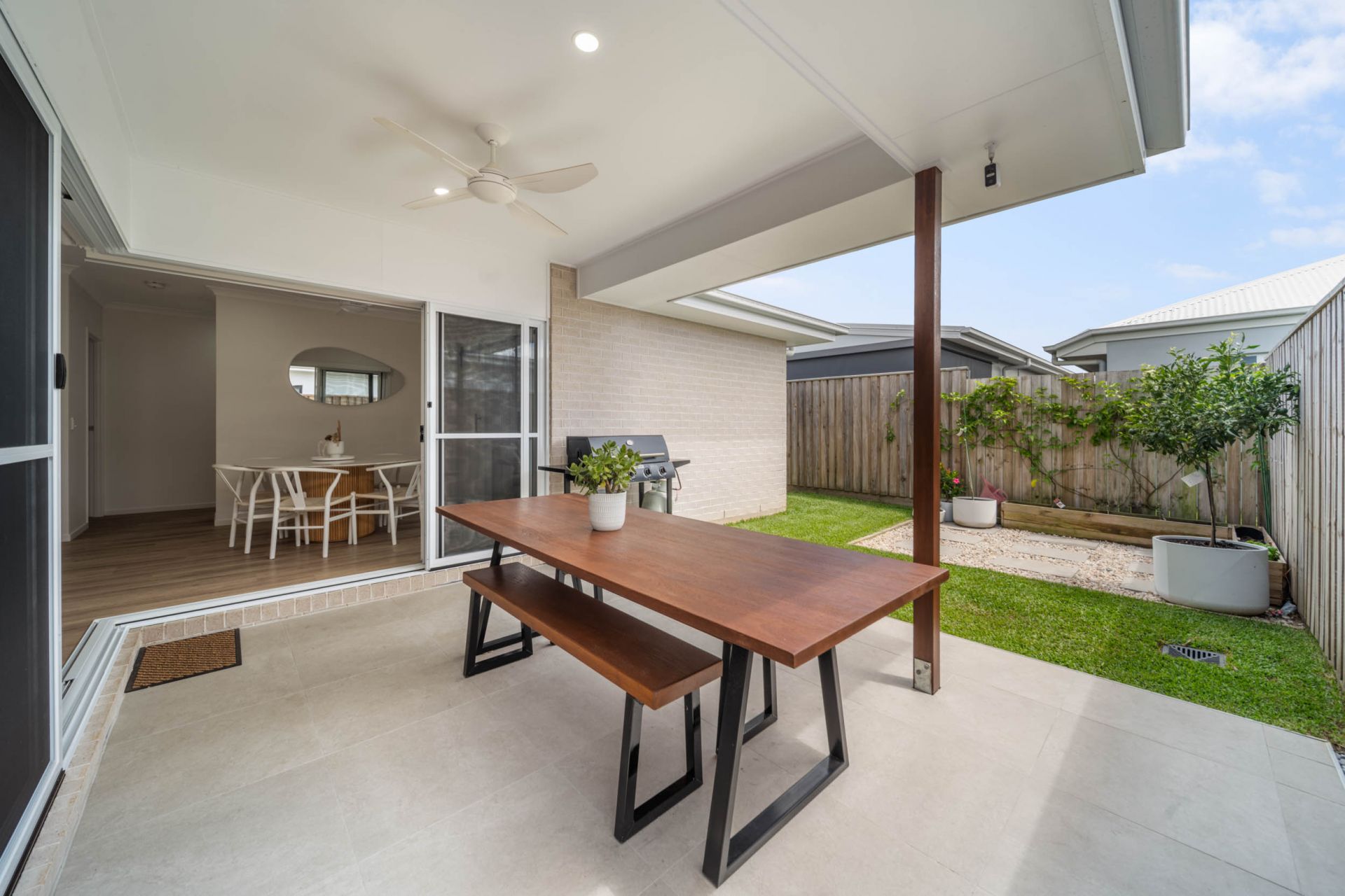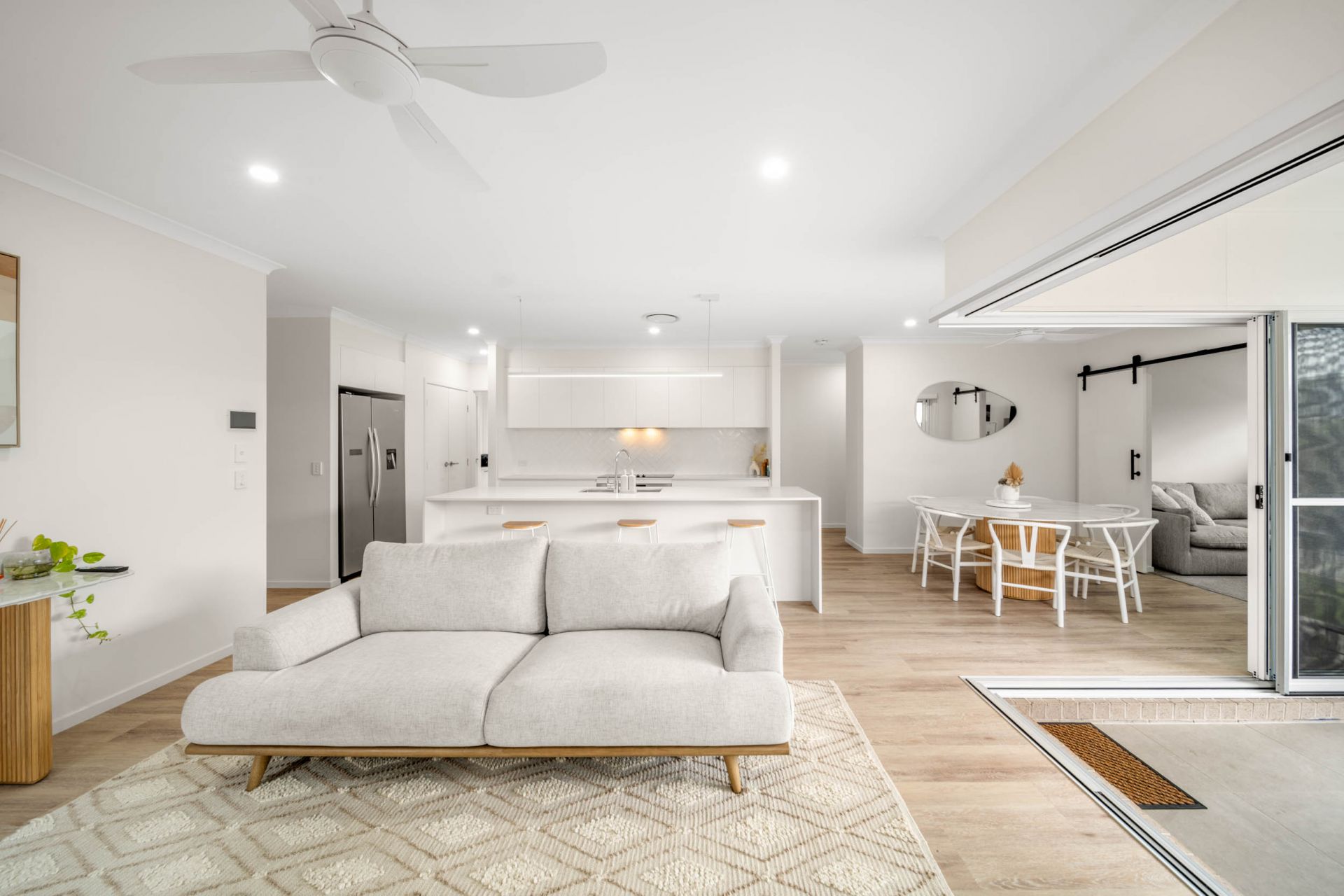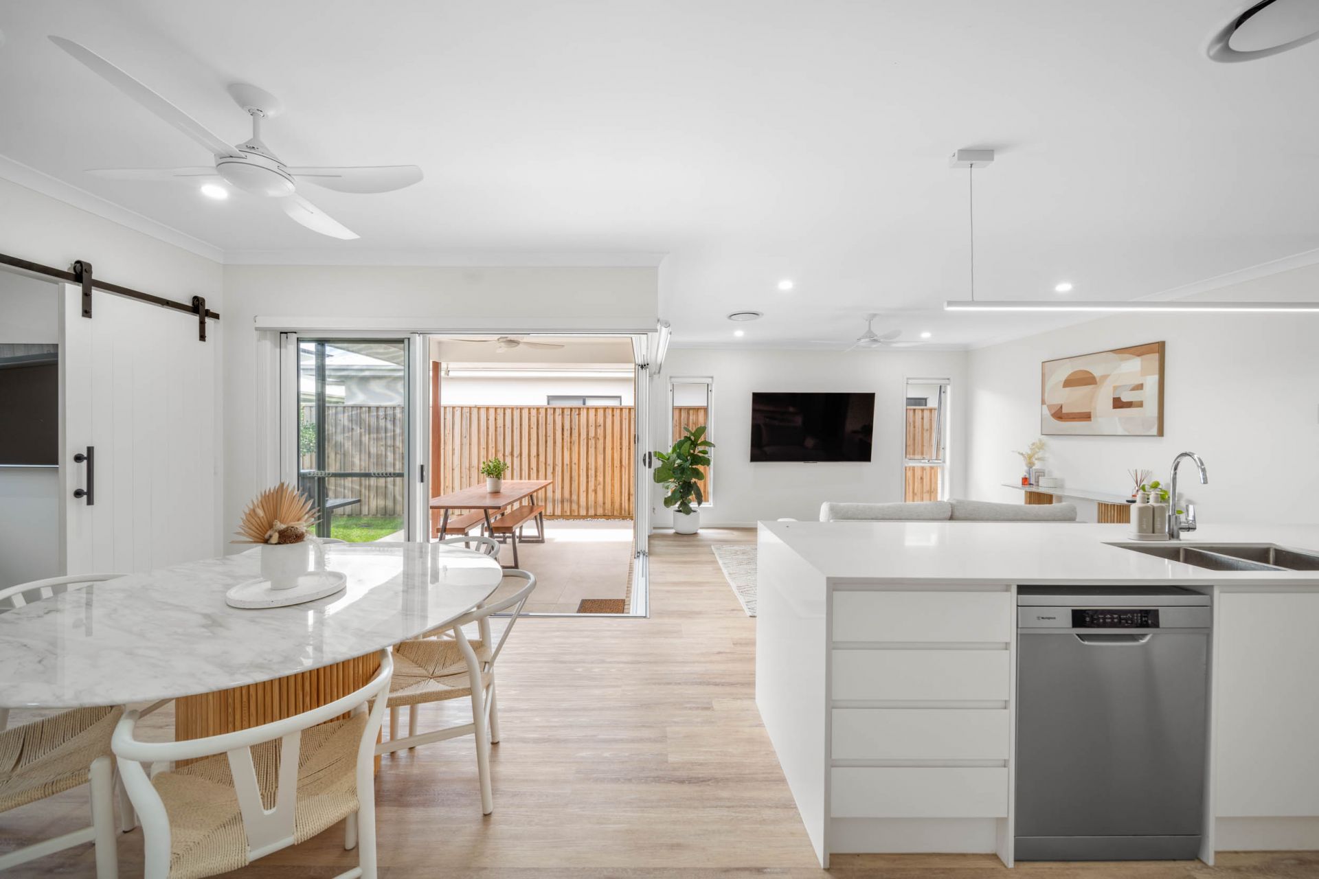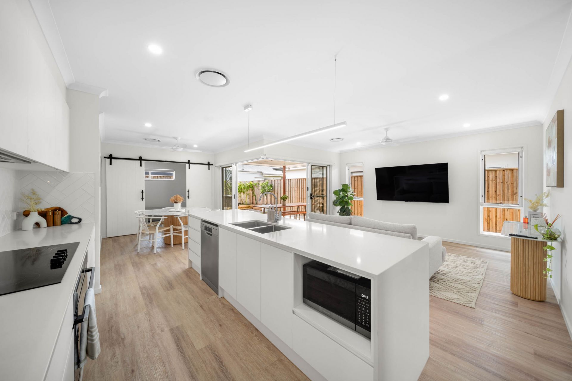The light-filled open-plan living and dining zones are enhanced by clean architectural lines and quality finishes, flowing seamlessly to the outdoor entertaining area, an inviting space for relaxed living and effortless entertaining.