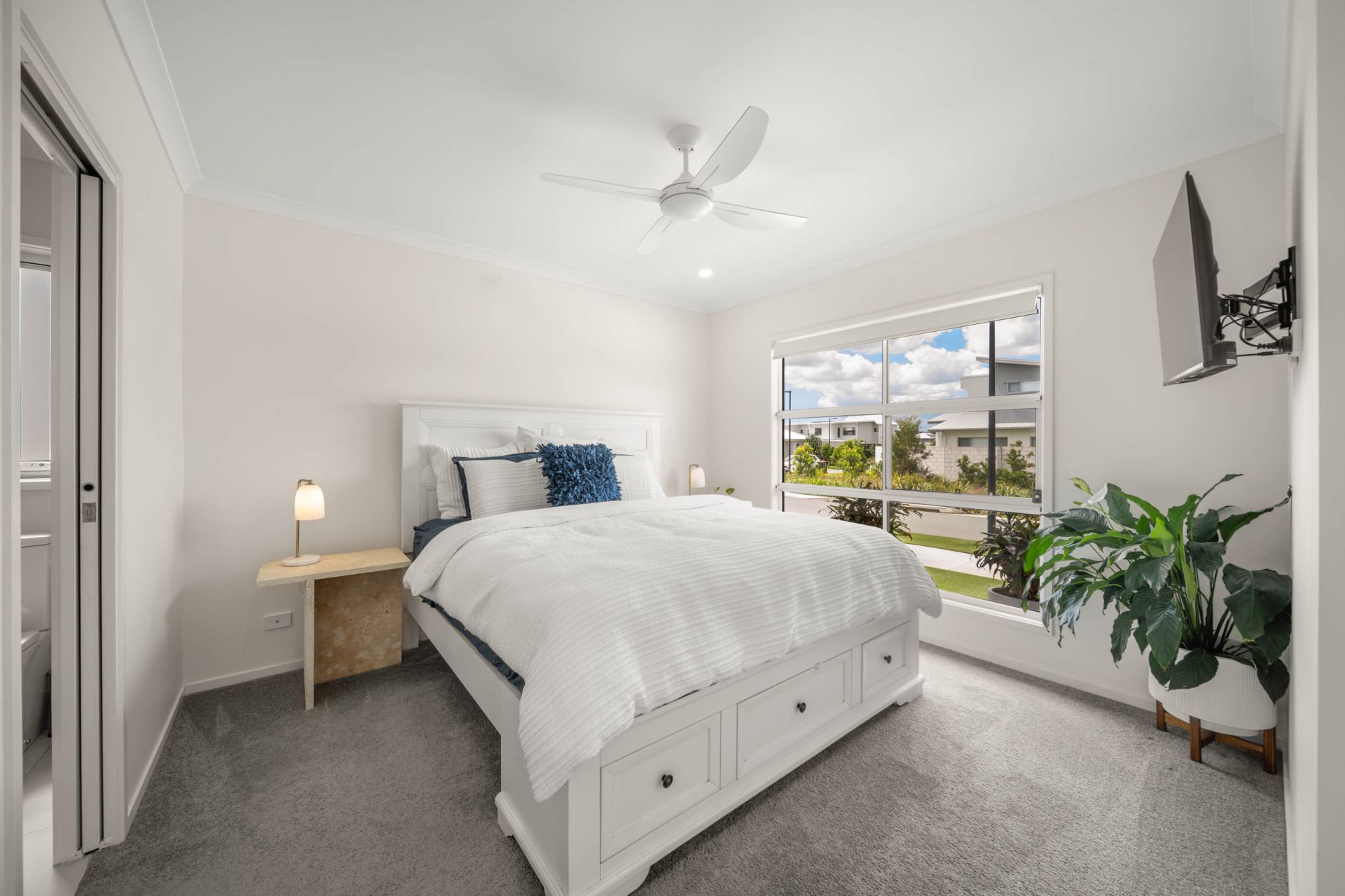 The accommodation is thoughtfully arranged, with generously proportioned bedrooms offering privacy and comfort. The master suite provides a serene retreat, complete with a walk-in robe and a stylish ensuite finished with contemporary fittings. The additional bedrooms are serviced by a modern central bathroom, continuing the home's cohesive and refined aesthetic.