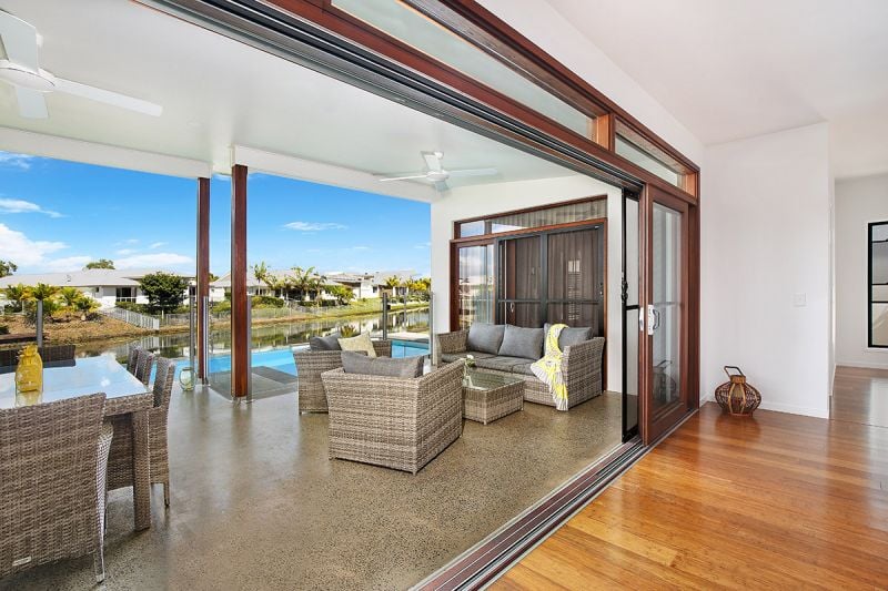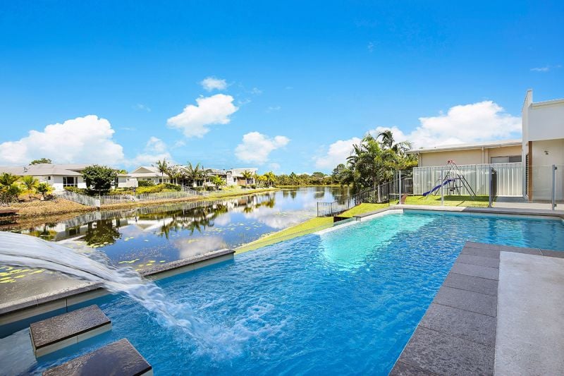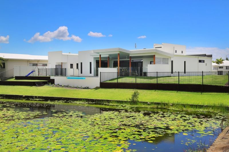 This architect designed, custom-built home on a 1238m2 fully fenced corner block, in an absolute waterfront position with 36 metres of water frontage, is the ultimate lifestyle home in a dress circle Pelican Waters location.