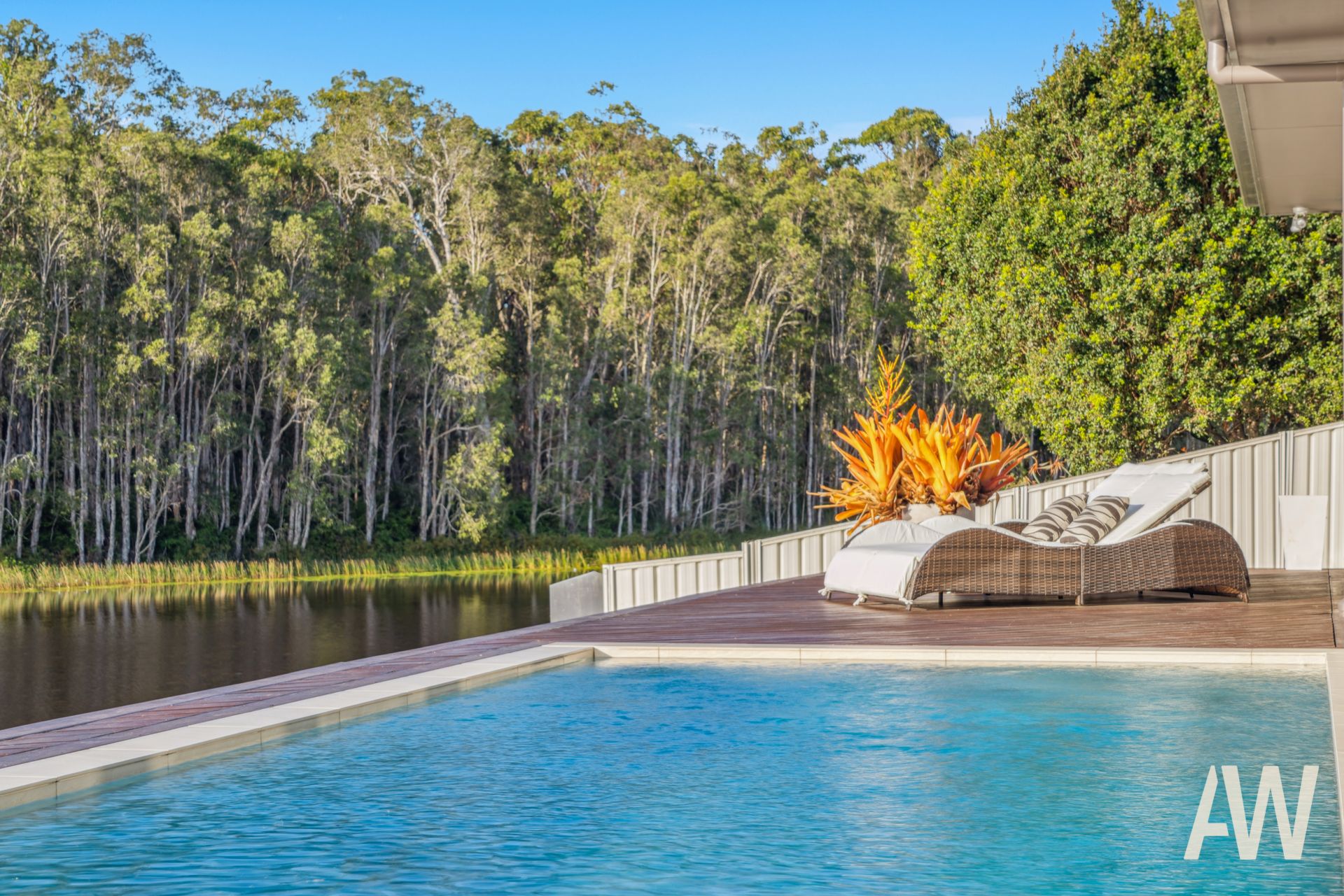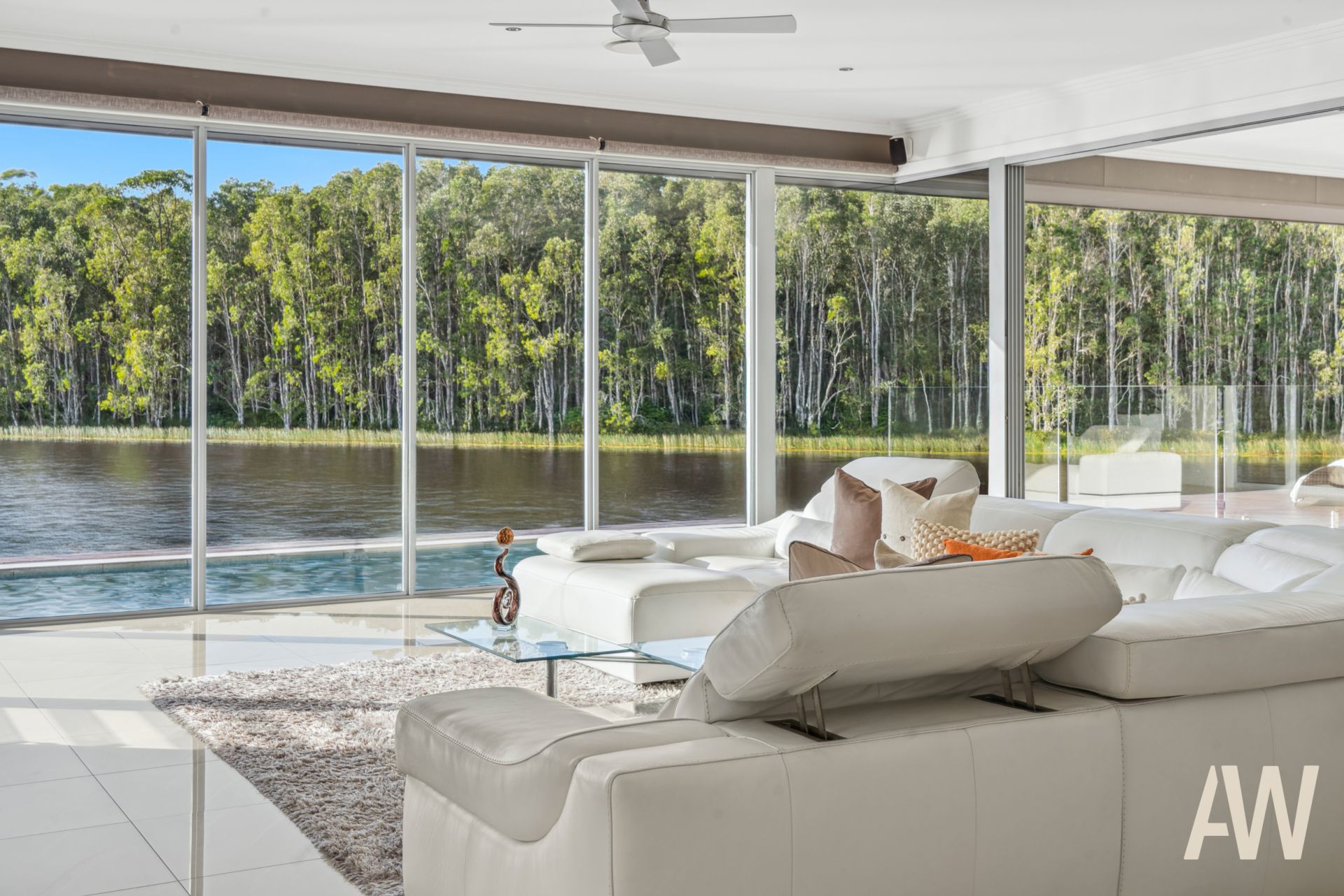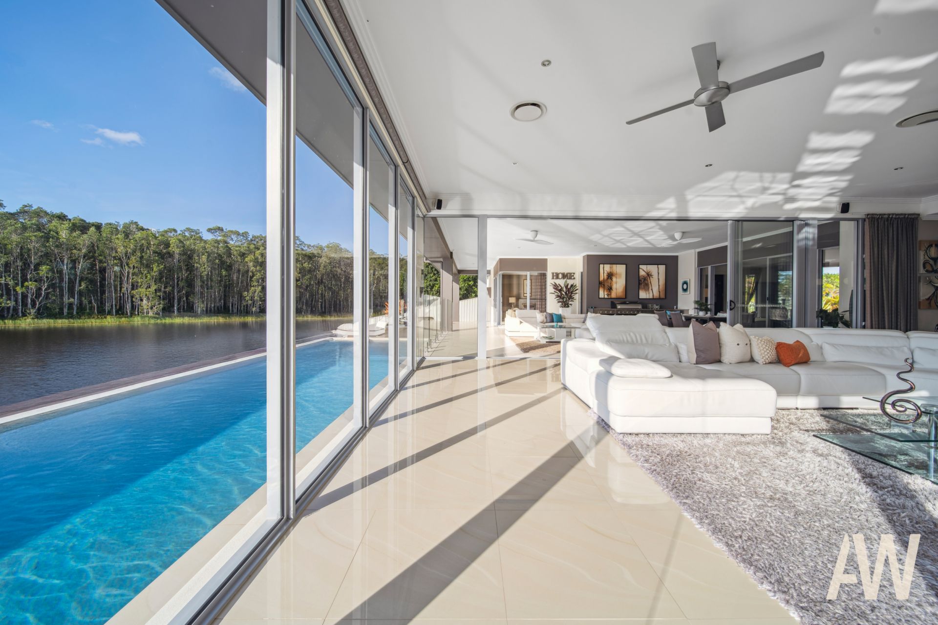 Amber Werchon Property presents to the market 10 Silky Oak Place, Pelican Waters, where luxury living meets breathtaking natural beauty and complete privacy. This north-facing, architecturally designed, award-winning masterpiece spans nearly 500sqm of custom-built space, set back from the street on an expansive 1,607sqm block, offering unparalleled seclusion in a quiet, end-of-lake position with only one neighbour.