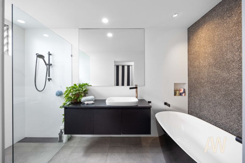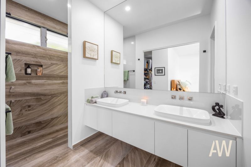 The master suite is a true retreat, radiating coastal elegance. Bathed in natural light, it offers a walk-in robe, plush wool carpet, and ceiling fans for year-round comfort. The opulent ensuite is designed to impress, with floor-to-ceiling feature tiles, twin vanities, and a spacious, oversized shower – a perfect place to unwind after a day at the beach.