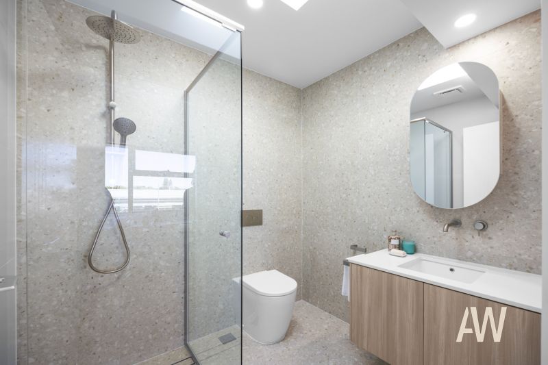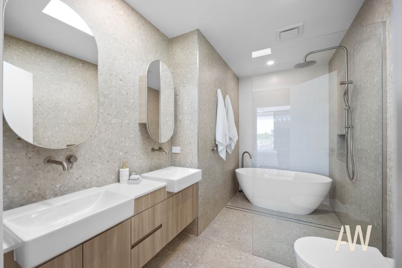 Offering an impressive 262sqm of living, high-end fixtures and finishes are showcased throughout. Highlights include ducted air-conditioning, ceiling fans, engineered timber floors, plush carpet, Terrazzo and Helsinki tiling, polished concrete, Caesarstone benches, premium appliances, brushed nickel tapware, direct terrace access from the master suite, slimline rainwater tanks, generous storage, and a soft neutral palette.